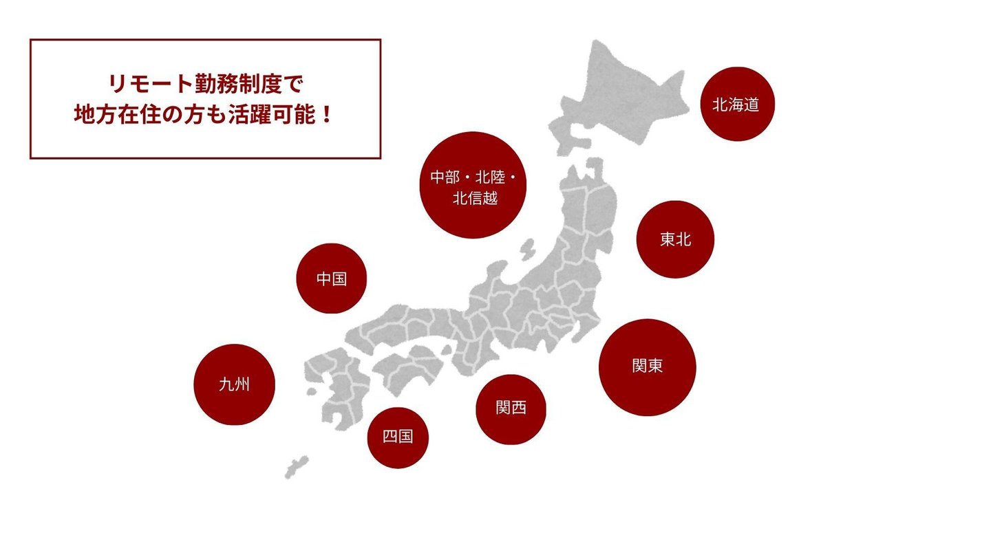 A.全国各地で可能です。当社はリモート勤務制度を設けていますので地方在住の方も活躍可能です。詳しくは当社の各種求人をご確認ください。