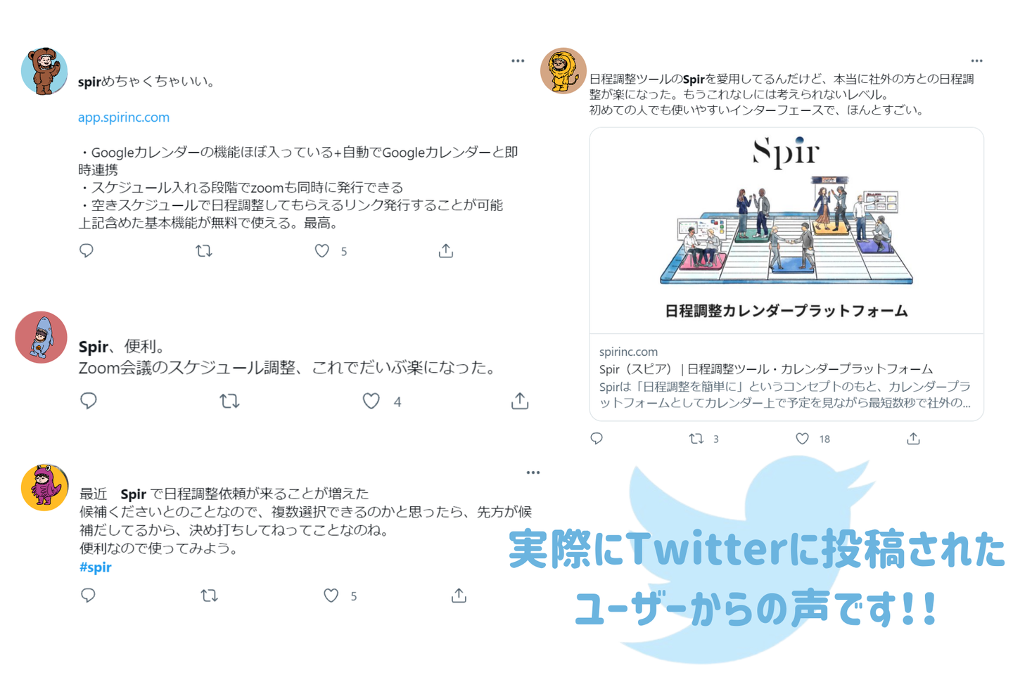 定期的にユーザーへのアンケート調査を行ったり、時にはTwitterで「Spir」と検索をかけてユーザーの生の声を聞くように心がけています。