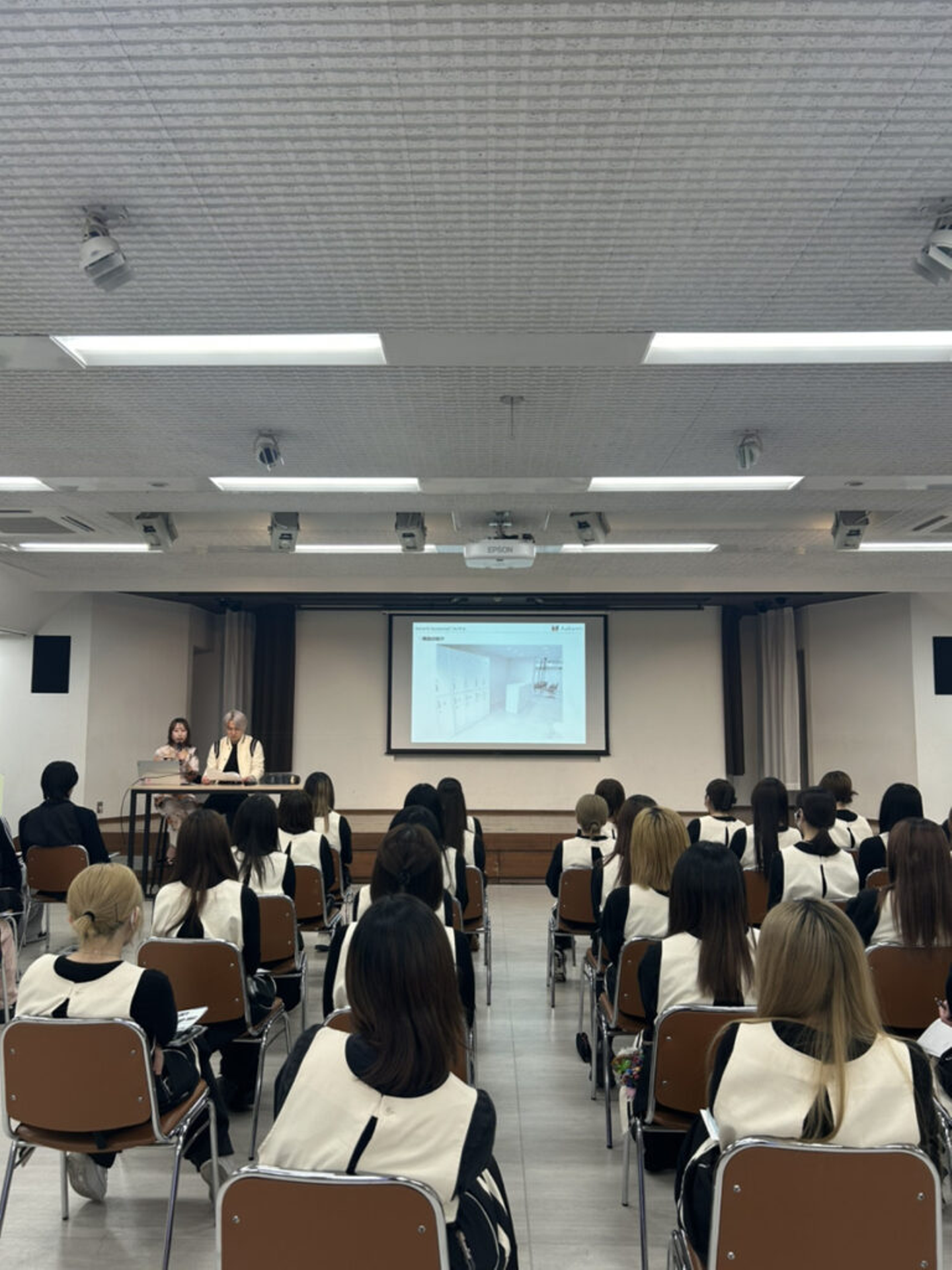 今回のガイダンスには、Ashantiから人事部2名と同校の卒業生である高梨MGが登壇し、実際に同じ学校で学んだ先輩としての経験も交えながら、美容学生の皆さんへお話しさせていただきました。