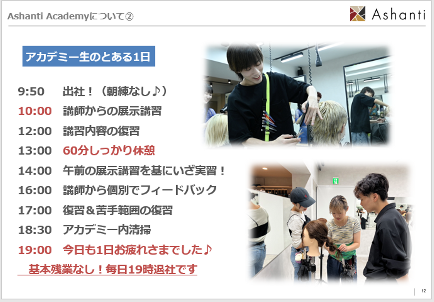 1日8時間・完全週休二日制の環境の中で、ワークライフバランスを大切にしながらスタイリストデビューを目指せること、そして短期間で確かな技術を身につけ、最短でスタイリストデビューを叶えられることがAshantiアカデミーの大きな魅力です✨