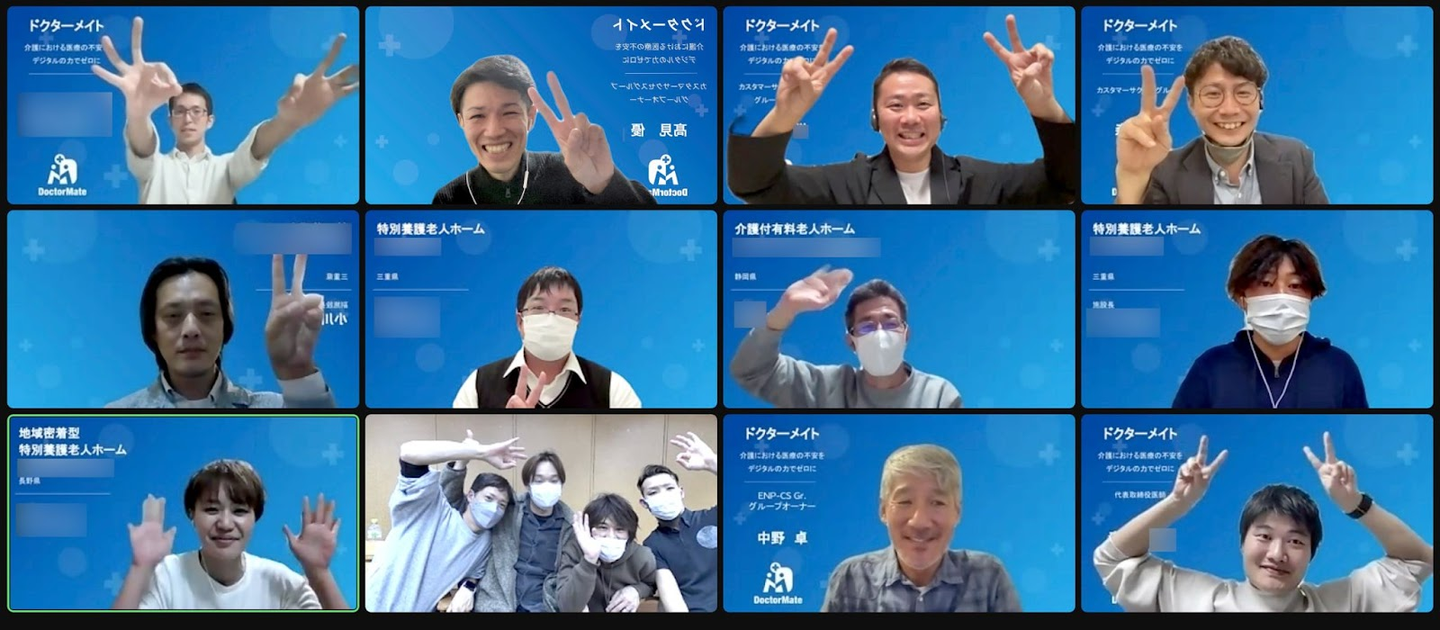 (写真:KAIGOメイト集合写真。同じデザインのzoom背景を用意して開催)