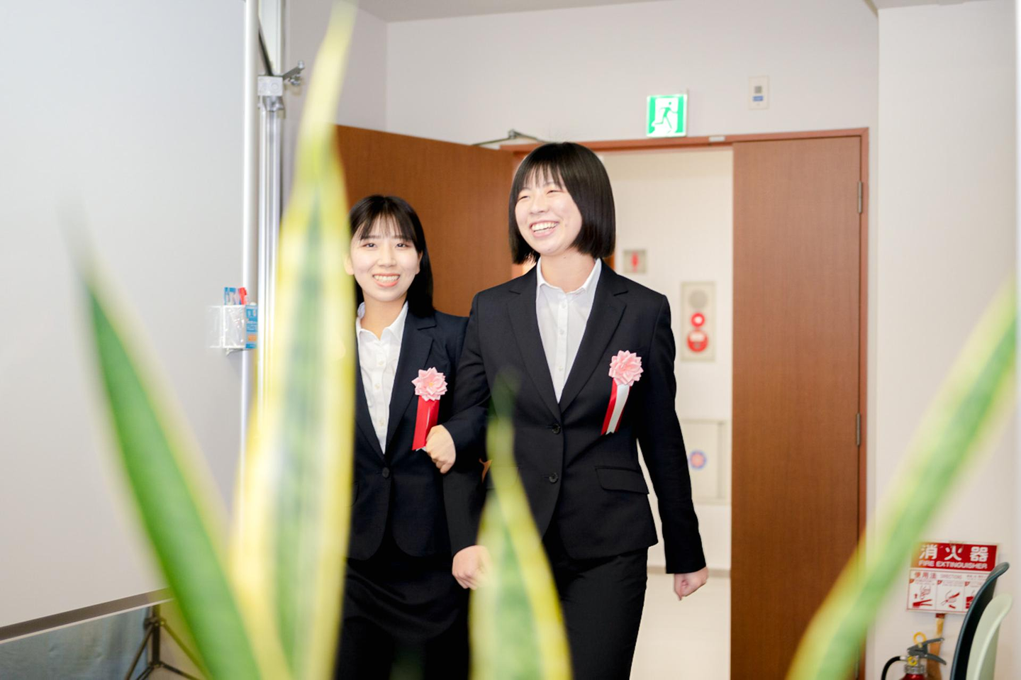 メンバーの拍手に包まれながら、真新しいスーツをビシッと着こなしたふたりが笑顔で登場! 胸の花飾りが初々しい!