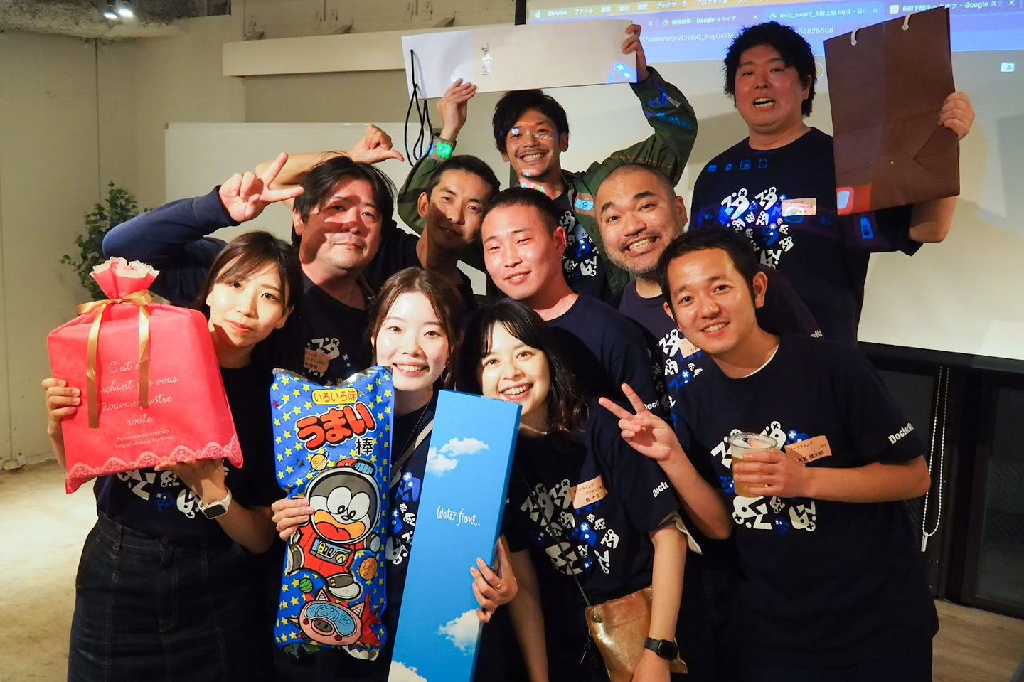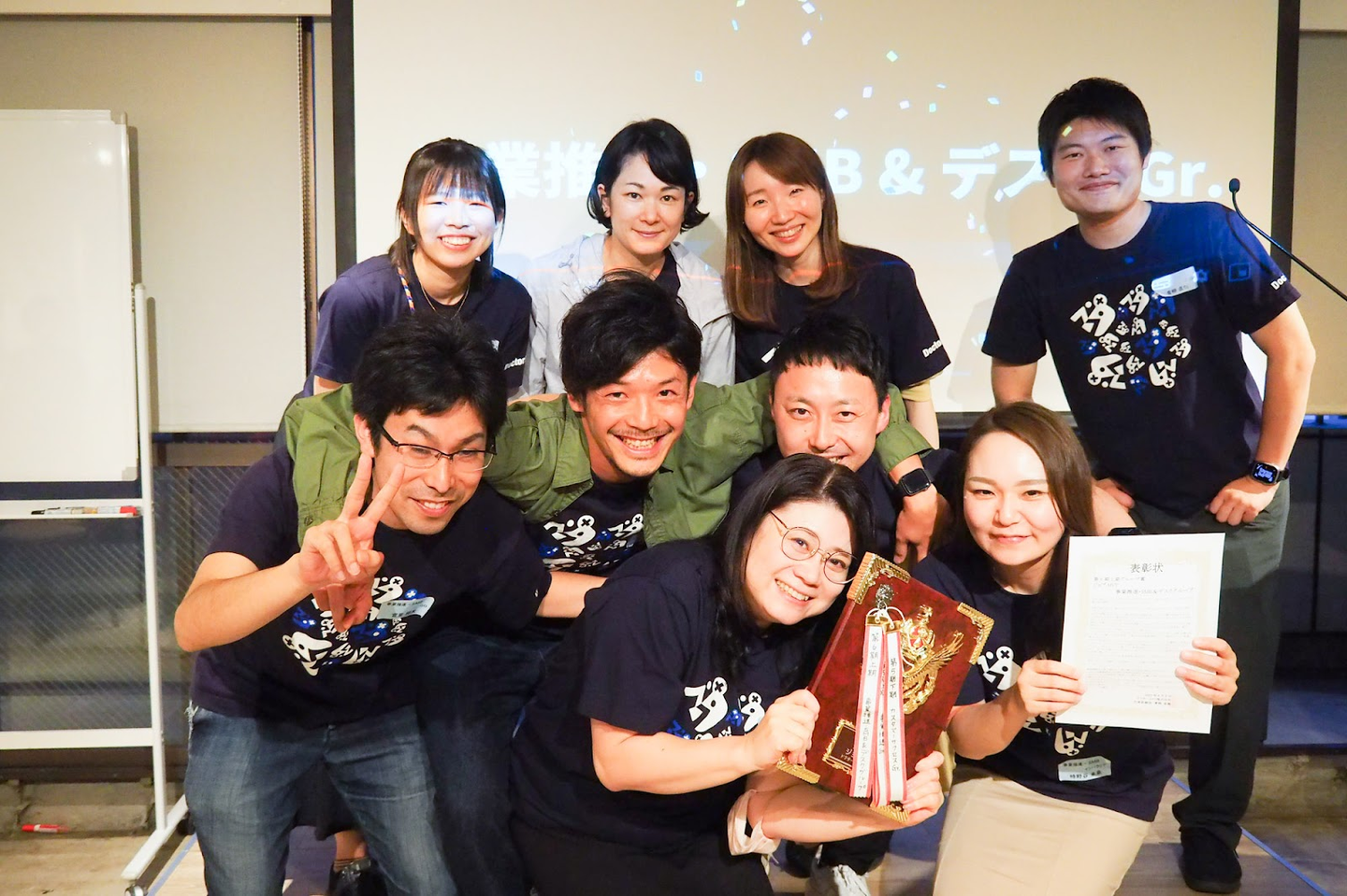 表彰式の後に壇上に呼ばれたメンバーが。営業力強化のために勉強し、中小企業診断士の資格を取得したという努力家な杉山さんに、チームメンバーからサプライズプレゼント!