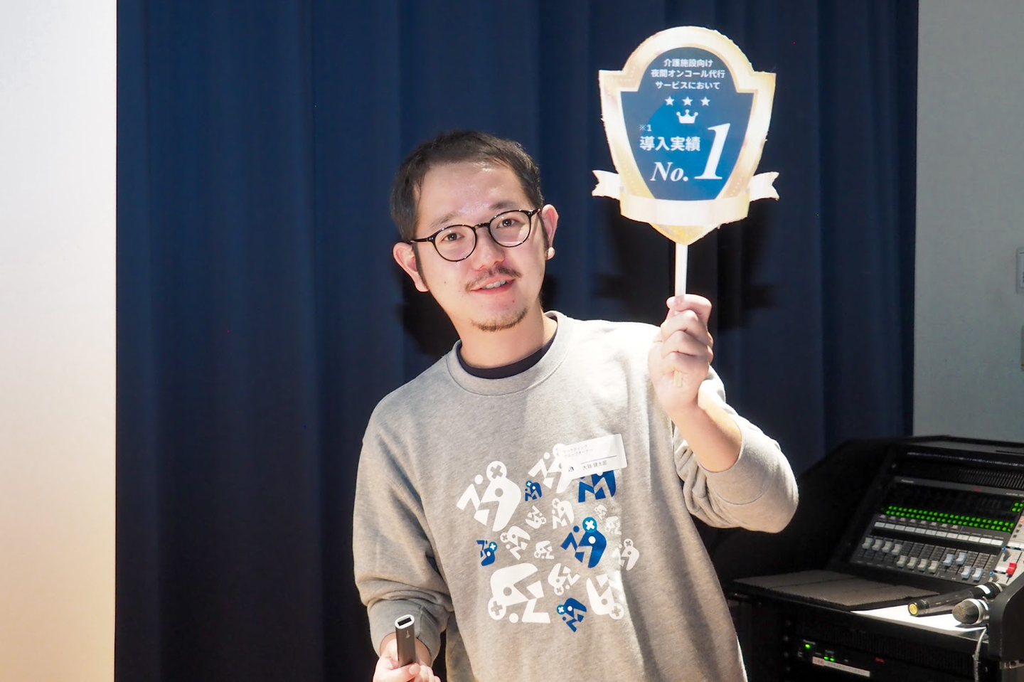 今年10月の調査で獲得した「介護施設向け夜間オンコール代行サービス業界利用率No.1」の称号(※)を掲げて、誇らしげに発表をしていたメンバーも。