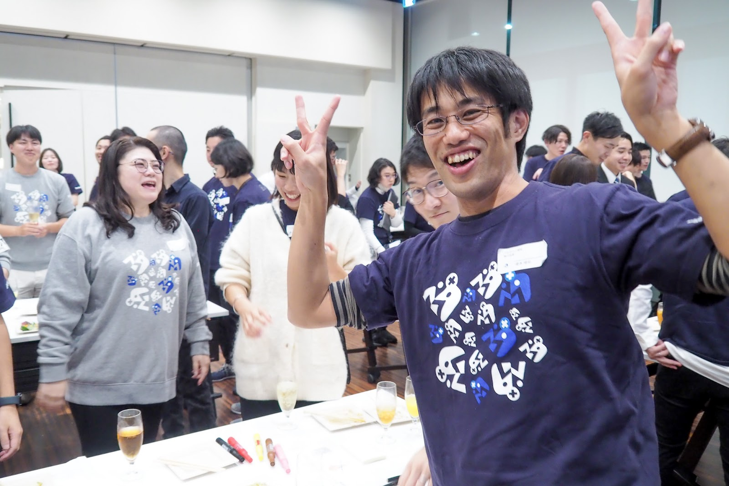 内定式の後は、毎年恒例のゲームが開かれました。今年のゲームは「共通点探し」! 新卒2期生と直近の新入社員をリーダーとして、チーム内で共通点を何個見つけることができるか!?というゲームです。