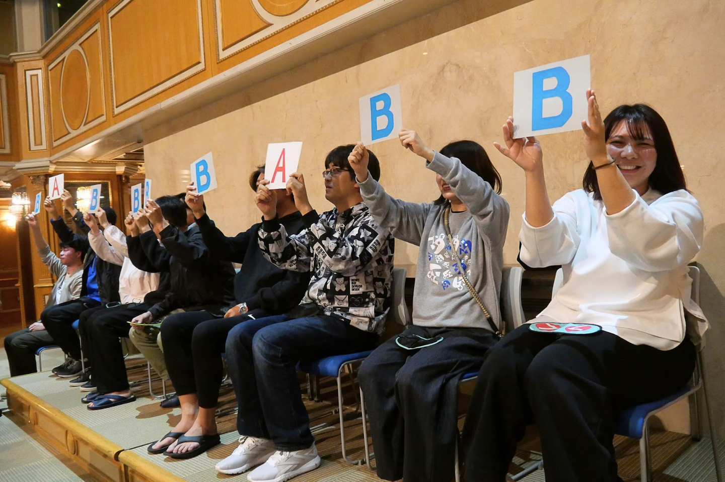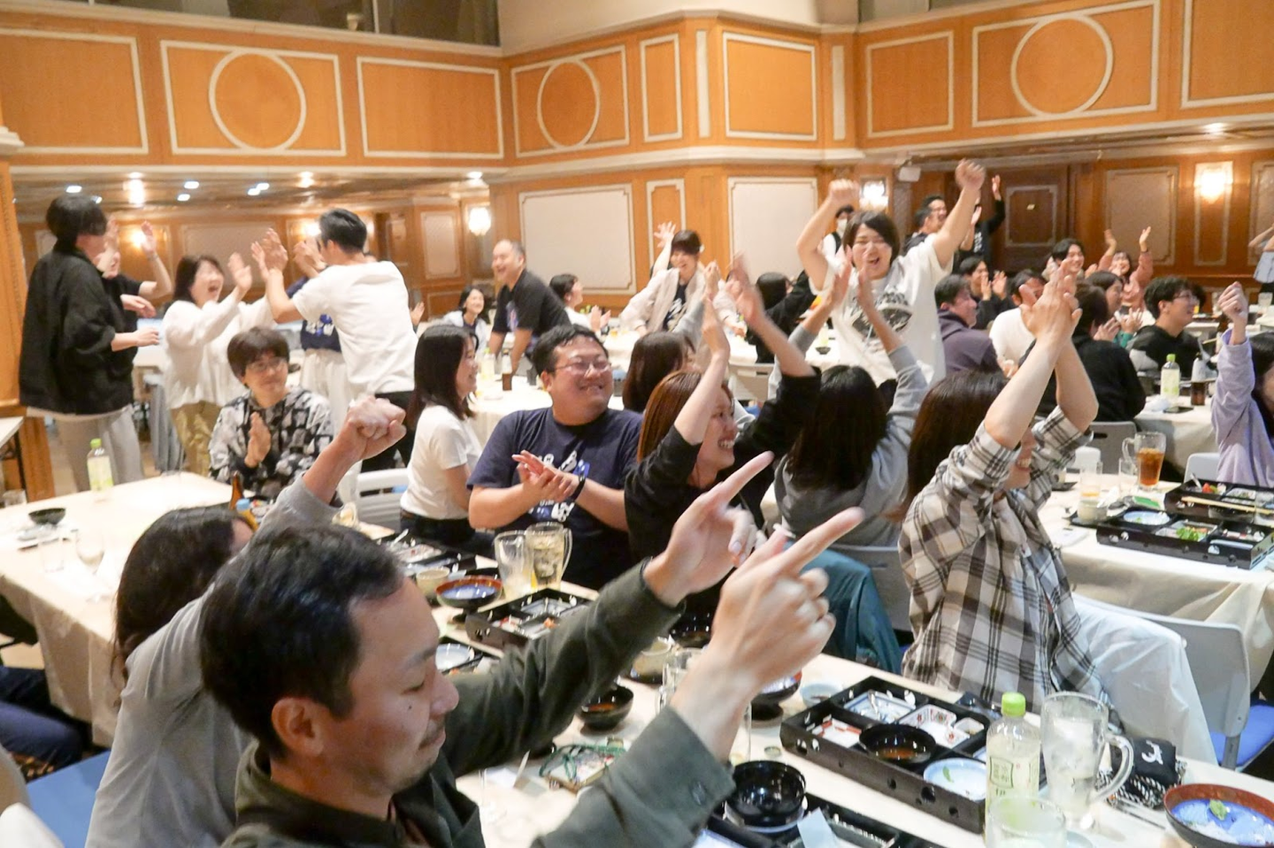 大盛り上がりの運動会を開催した小学校を後にし、夜は宿泊ホテルでの懇親会です。懇親会では宴会係による【格付けチェック】!