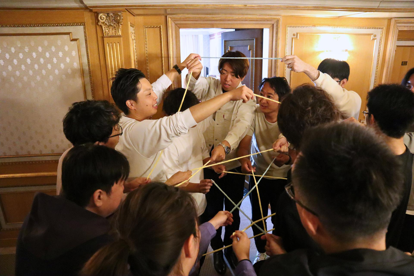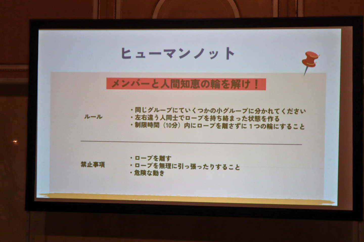 左右違う人同士でロープの端と端を持ち、絡まった状態を作ります。そこからロープを持った手を離すことなく、一つの大きな輪の形になる、人間知恵の輪ゲームです。