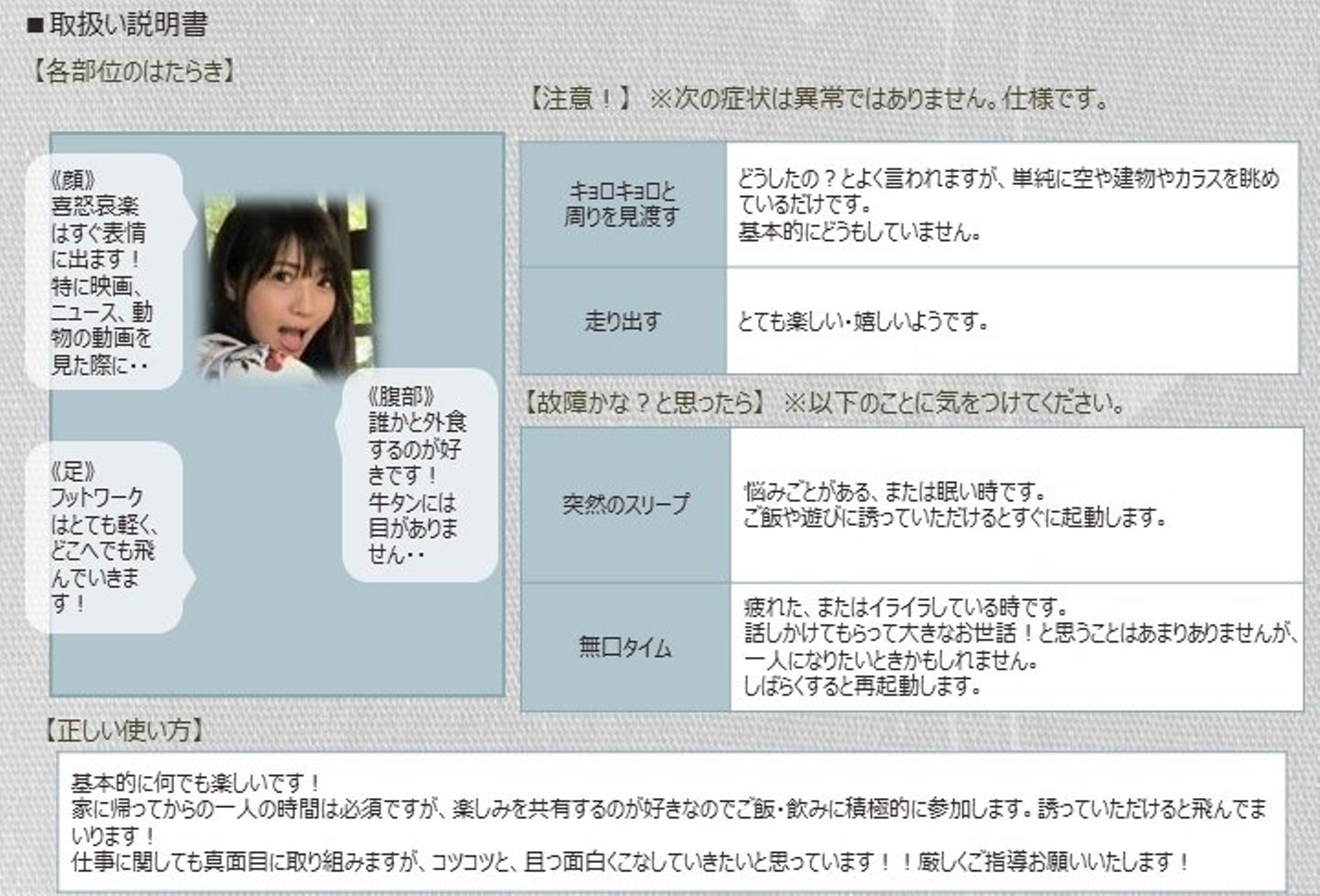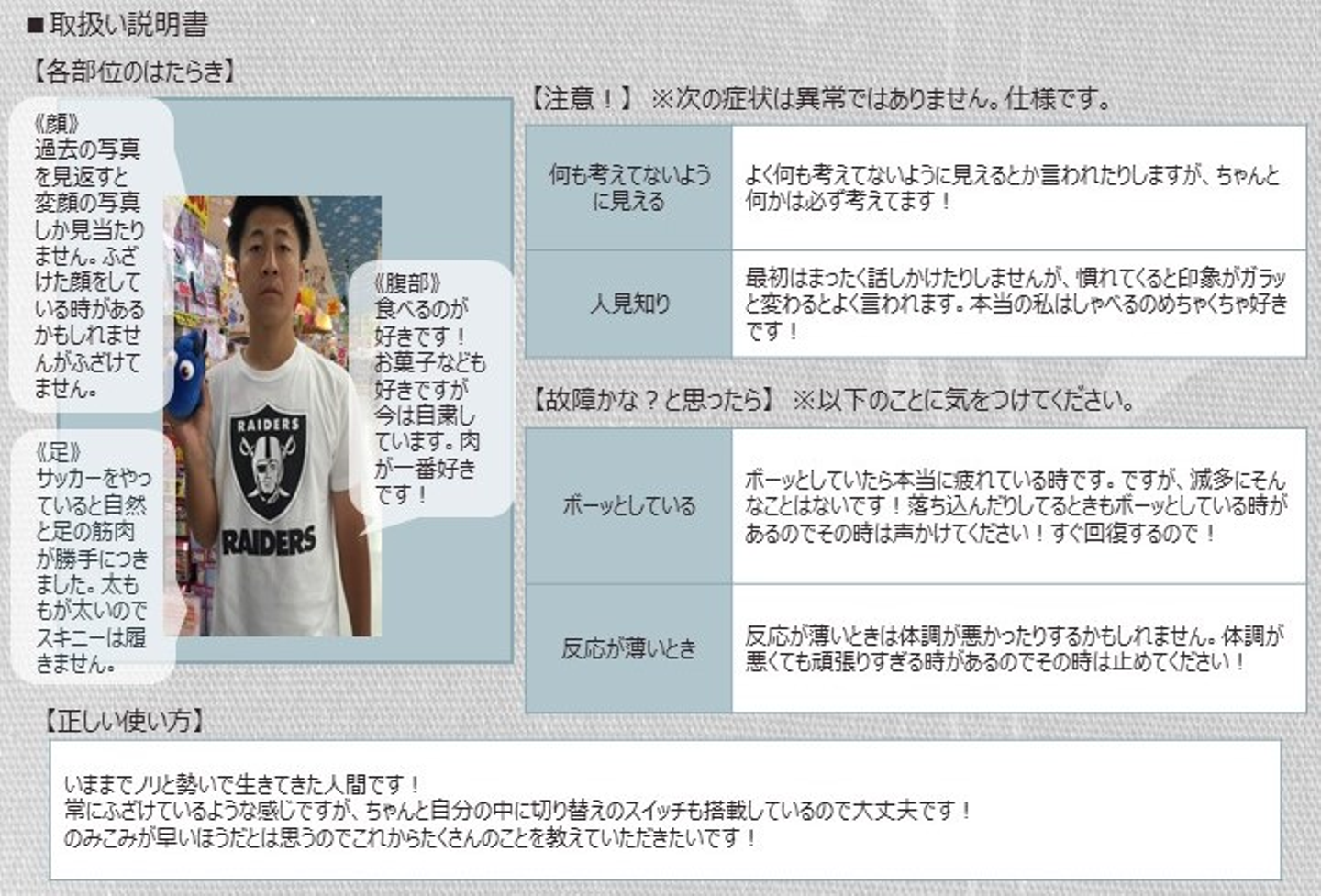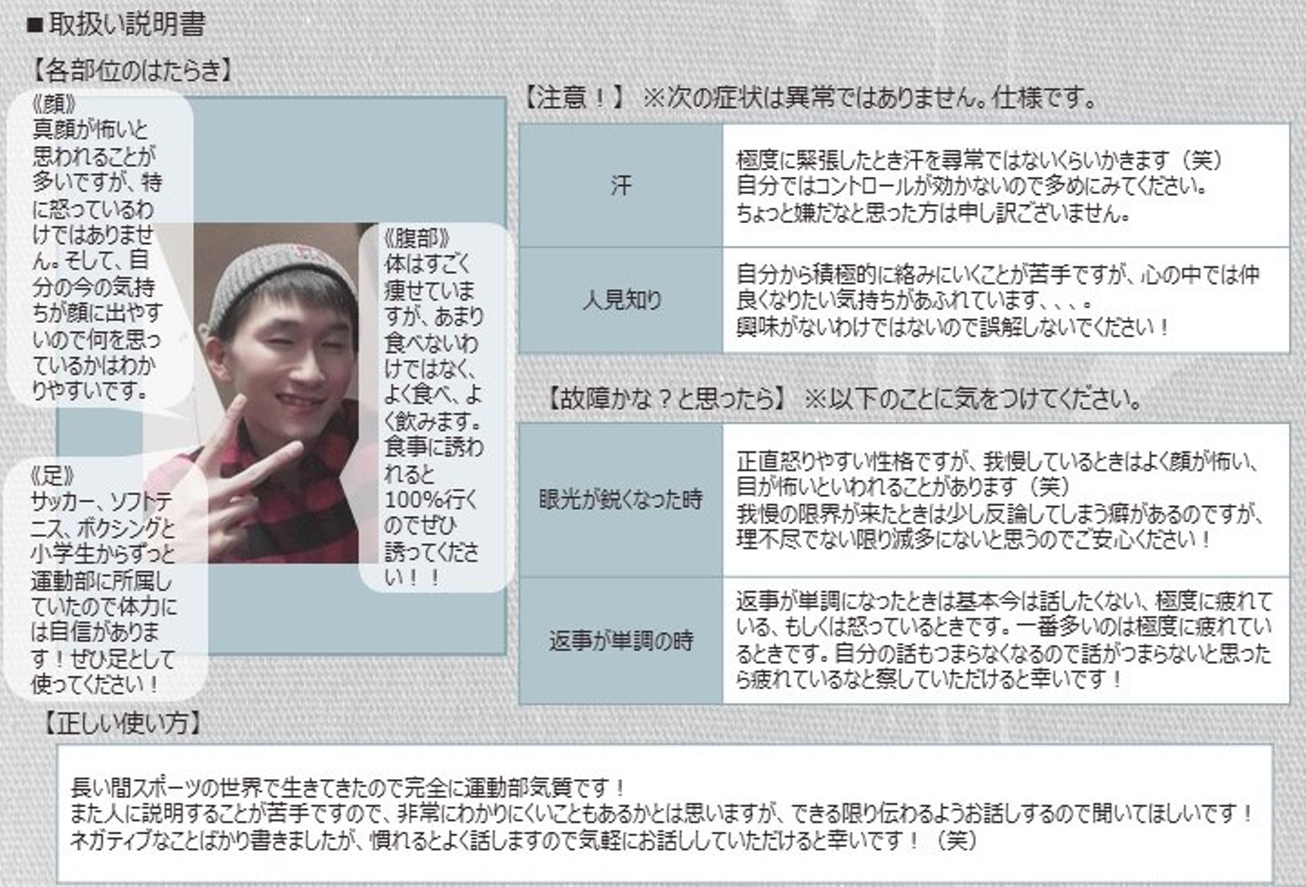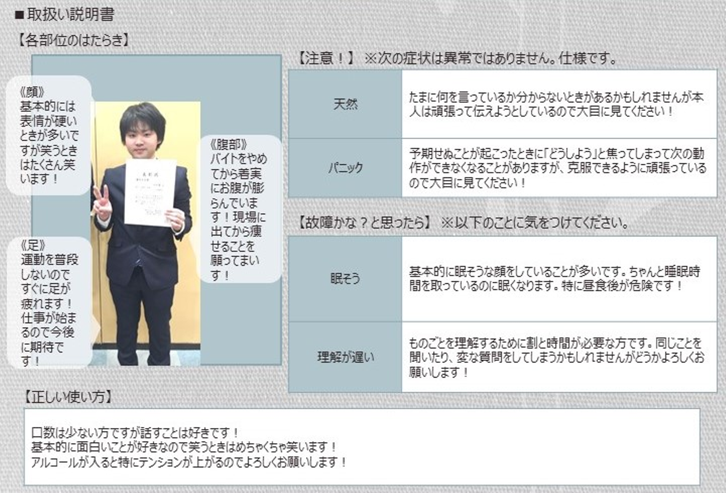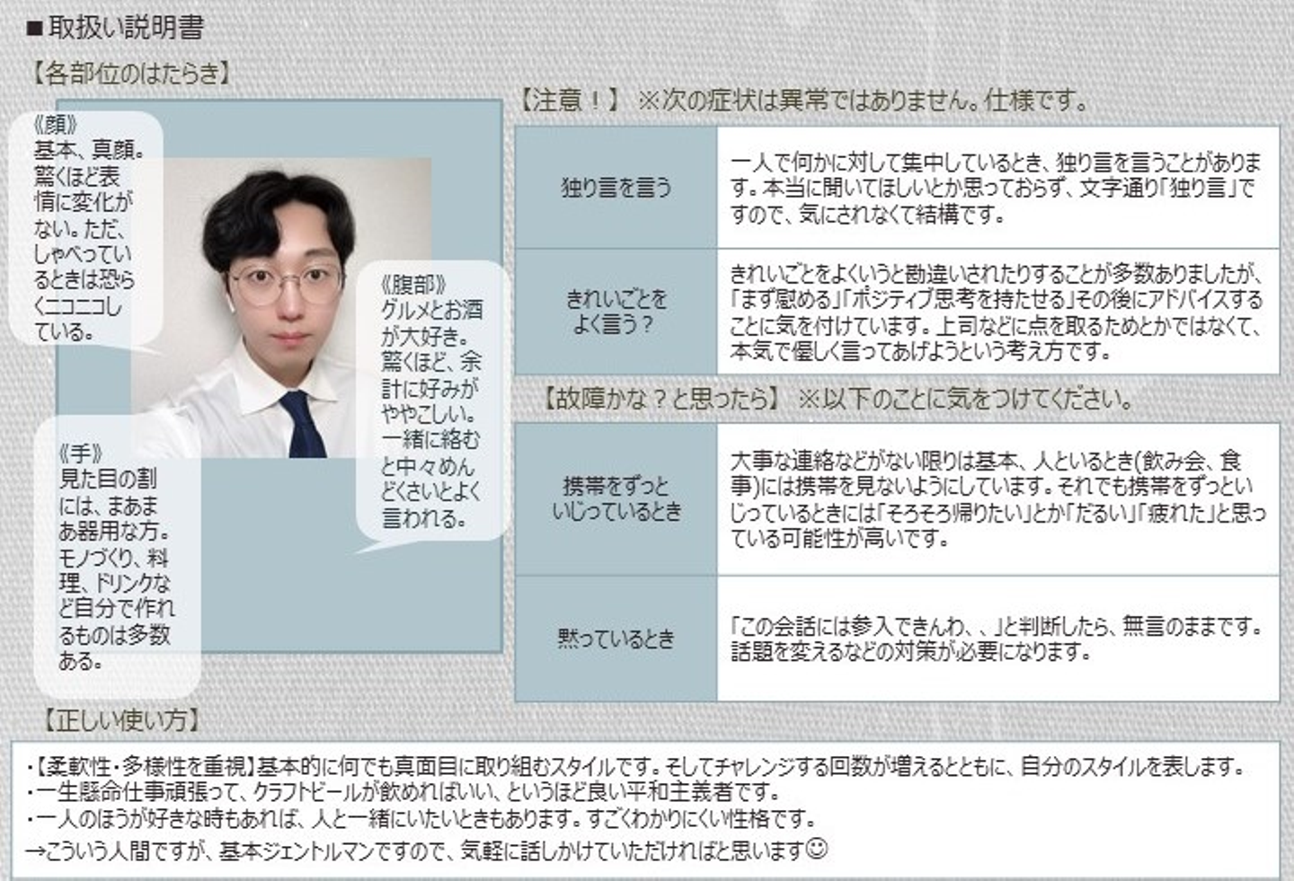 今回は前回に引き続き、新卒の個性を知ってもらうために「私の取扱説明書」をご紹介いたします。
