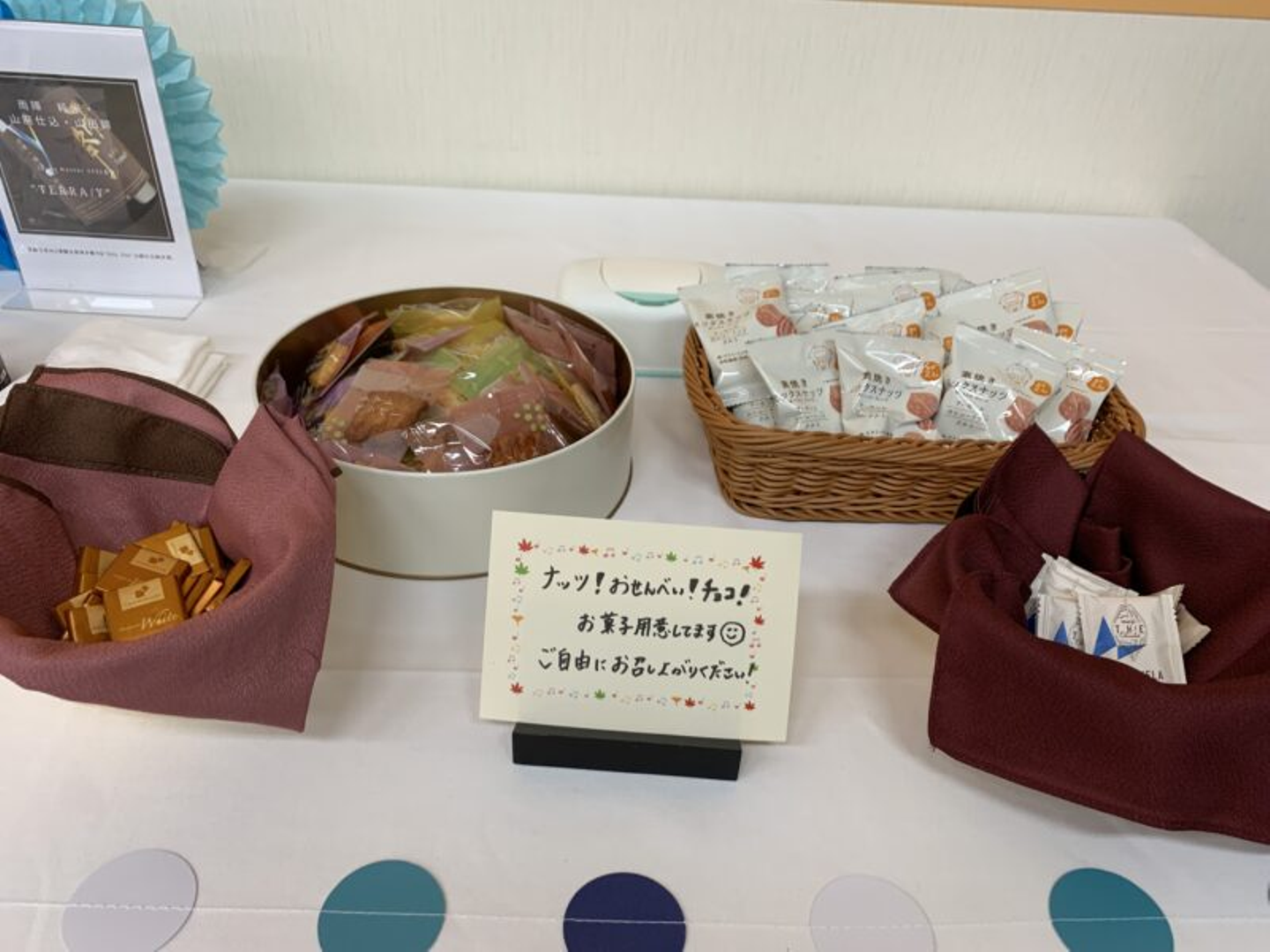 学生たちがまず案内されたのは、たくさん用意したドリンクとお菓子がいっぱいのカウンター。そこにはなんと!
