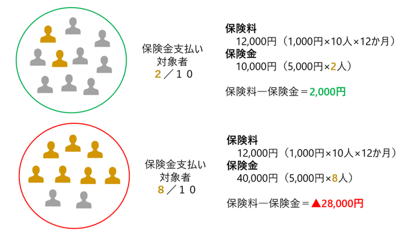 保険料1,000円/月、保険金5,000円として、10人のグループ内にリスクの高い人=保険金支払い対象(になる確率が極めて高い)者を入れて、グループの収支を計算してみた。