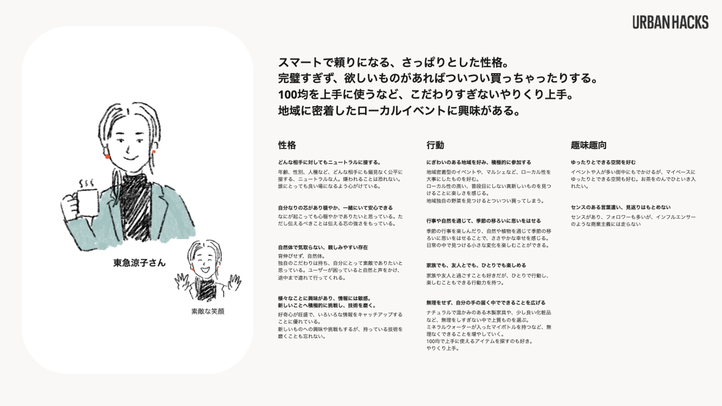 また、やってみて面白かったと思っているのが、「サービス人格」を作ったことです。公式サイトを人に例えるとしたら、どんな人か言語化しよう」というワークショップで、URBAN HACKSメンバーだけでなく、ビジネスオーナーのメンバーも合わせて15人ほど集まって意見を出しあいました。「サイトを擬人化する」という感じです。