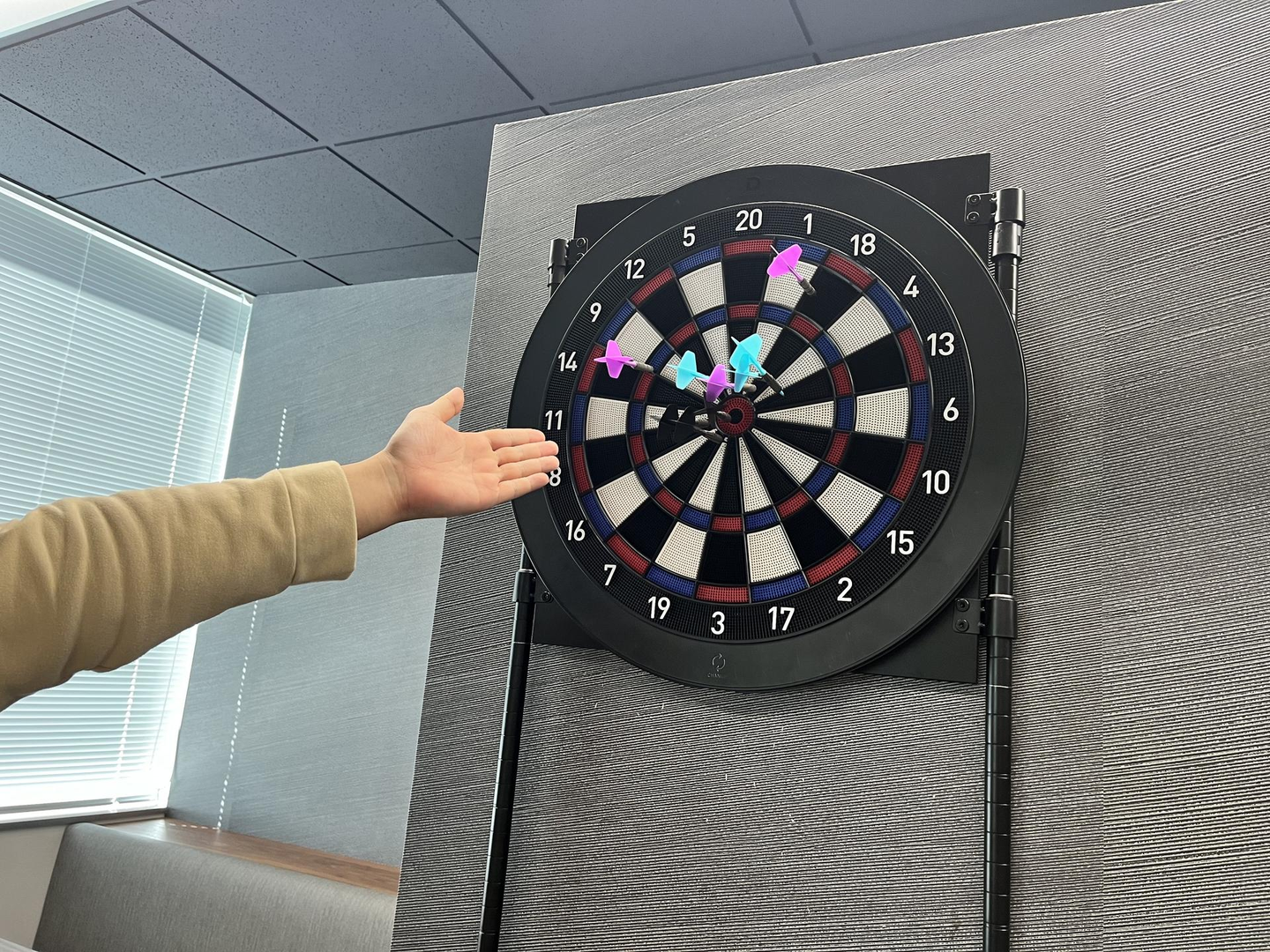 休憩スペースに導入されたダーツ台です。元々ダーツはあまりやったことがありませんでしたが、仕事の合間に軽く投げたりして良い気分転換になっています。