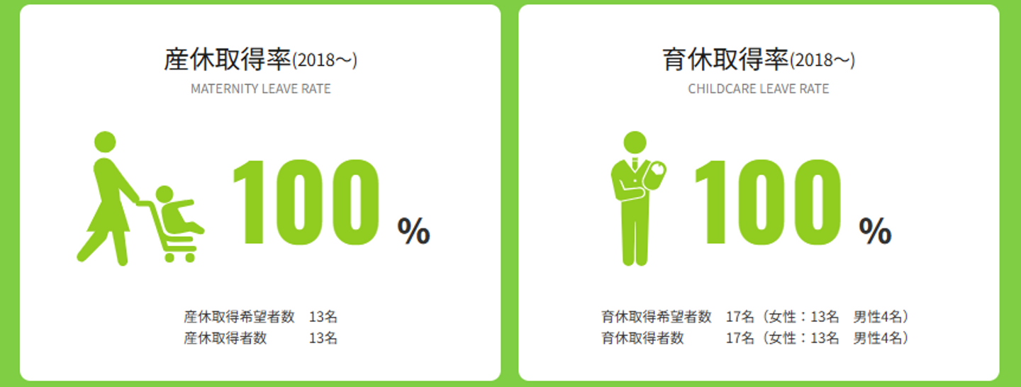社員がライフステージの変化を迎えても安心して働き続けられるよう、育休・産休の取得率100%を実現しています!また、復帰後には時短勤務はもちろん、それぞれのキャリアプランや家庭の事情を考慮した上で、最適な働き方を一緒に考え、実現できるよう努めています。