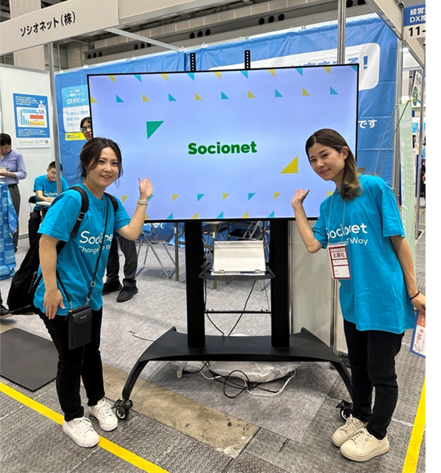 両日ともに猛暑日となりましたが、会場にはたくさんの方が来場し、どの企業ブースも盛り上がりを見せていました。今回はソシオネットのDXサービスを知ってもらおうと、全員で水色の「Socionet」ロゴ入りТシャツを着て、PRを行いました!