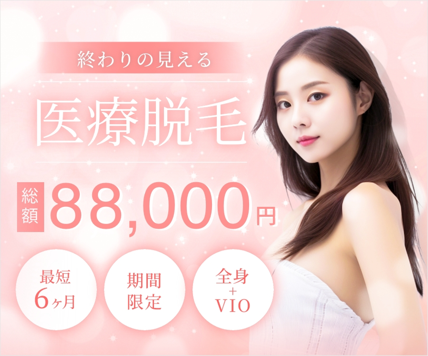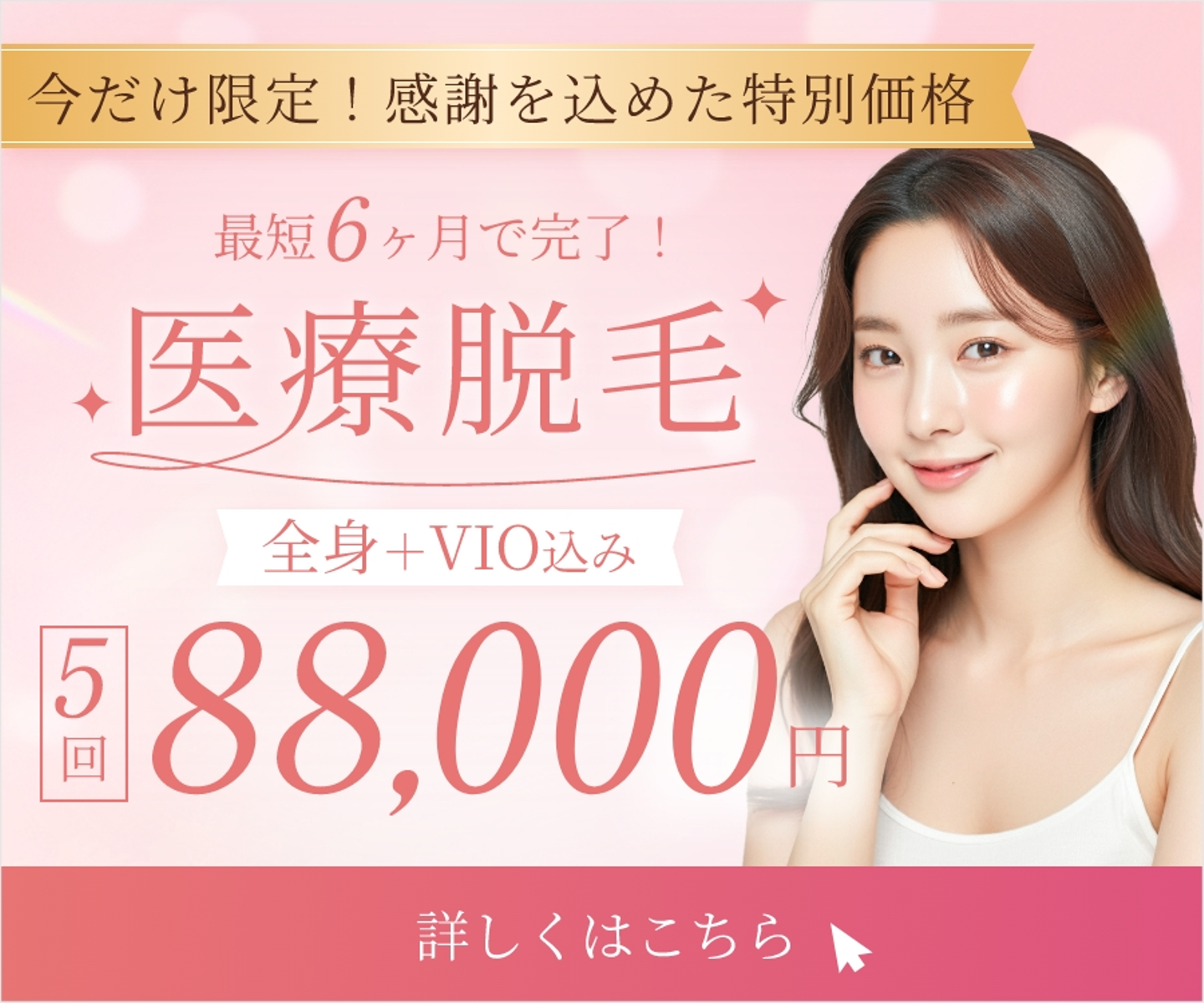 今回のバナーでは、最も伝えたい内容を見直し、テキストの優先順位をつけました。まず、医療脱毛の広告であることと価格が一目でわかるように配置しています。「最短6ヶ月で完了」や「全身+VIO込み」などの補足情報は、適度に目立たせつつも主張を抑えています。そして、「限定価格」が強調されるように、デザインに工夫を加えて少し目立つようにしています。