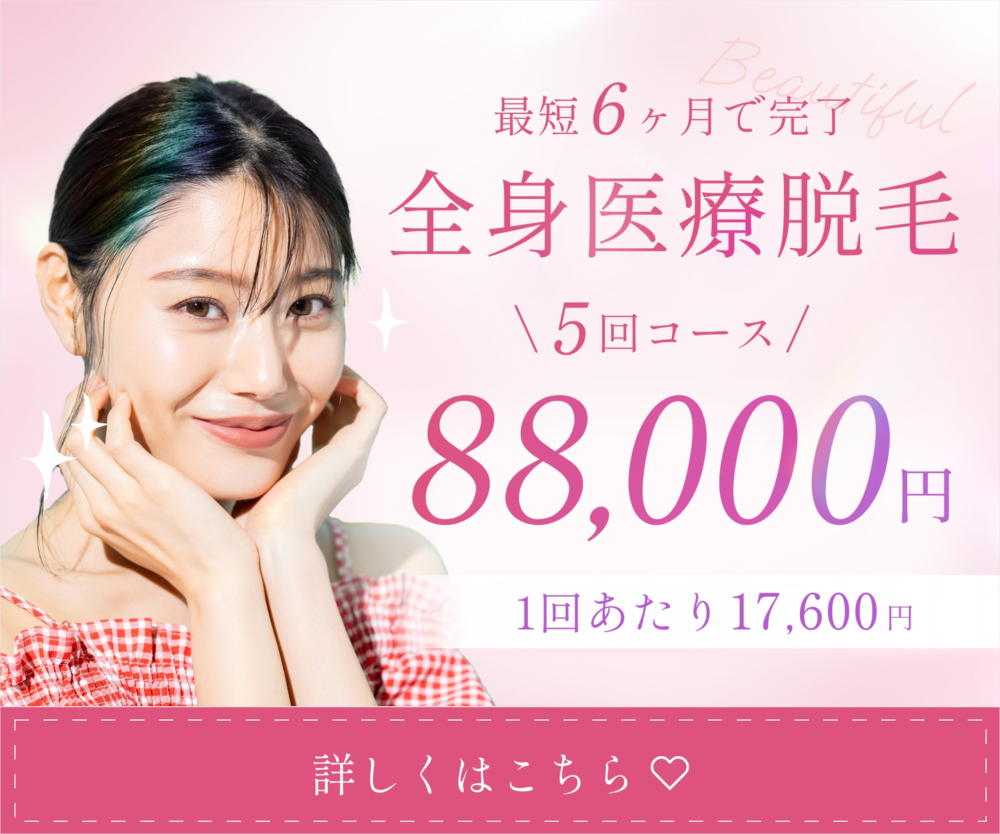 具体的には、「医療脱毛」の部分に線の装飾やキラキラを加え、さらにリボン風の装飾を取り入れることで、シンプルさの中にも華やかさを演出しています!これらの工夫が、ターゲットに響くデザインを目指したポイントです。詳細は、以下でご紹介します💡!