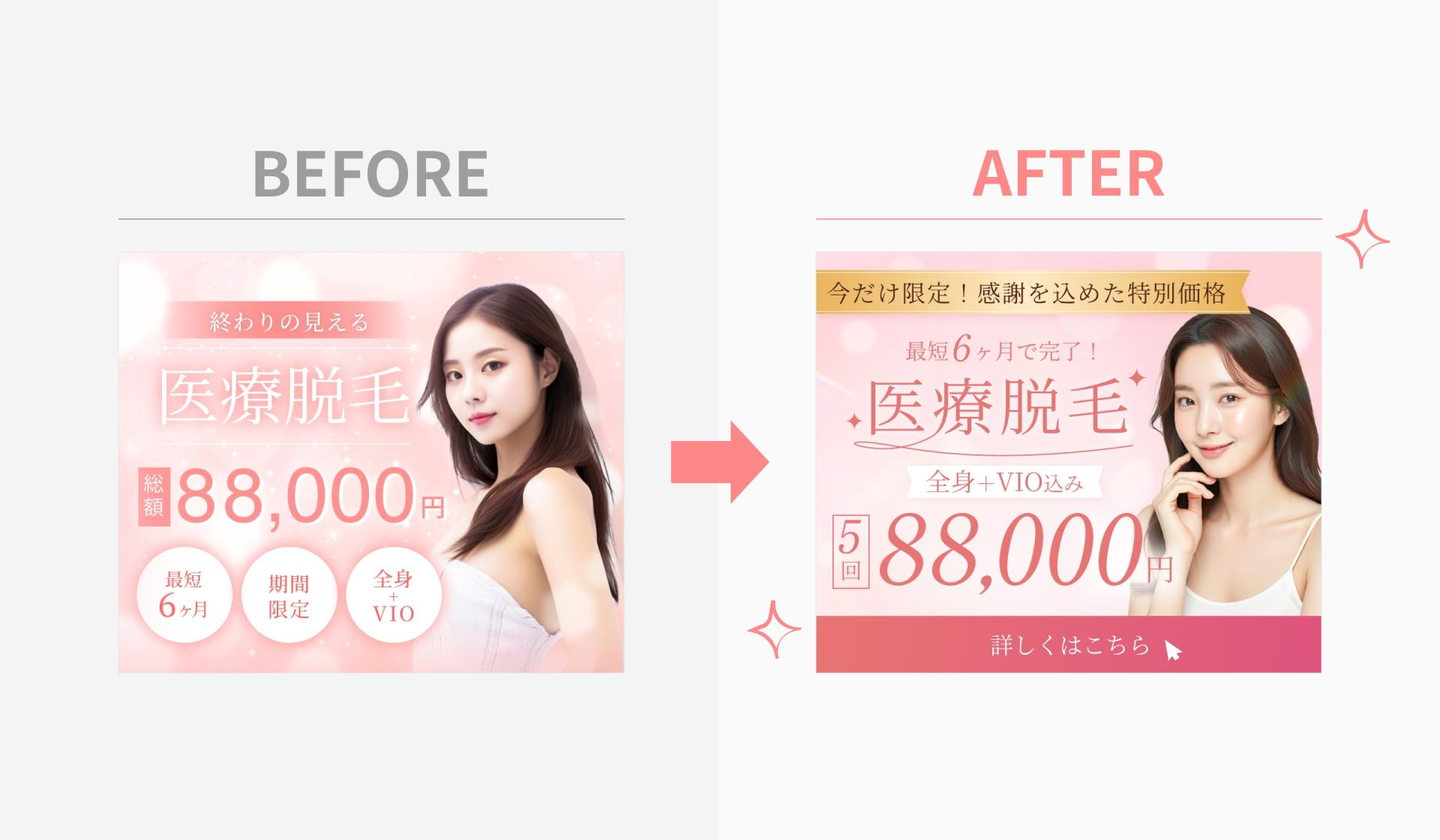 画像も改めて選び直しました!今回は、艶のある肌がしっかり見える女性を選び、より医療脱毛の広告らしい印象に仕上がったと思います。背景画像も、以前のはっきりしすぎたものから抽象的なものに変更し、情報量を整理することで、文字の視認性が向上しました。