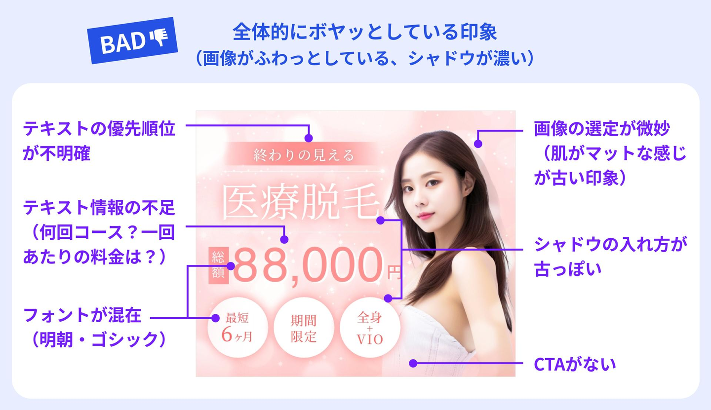 特に今回は医療脱毛の広告バナーなので、何回コースなのかや1回あたりの料金を明記すべきだったと思います。さらに、バナーなのにCTAがないというのは大問題で、ユーザーに次の行動を促すための基本的な要素が欠けています。このような必要な情報の不足は、広告としては致命的なミスでした…。