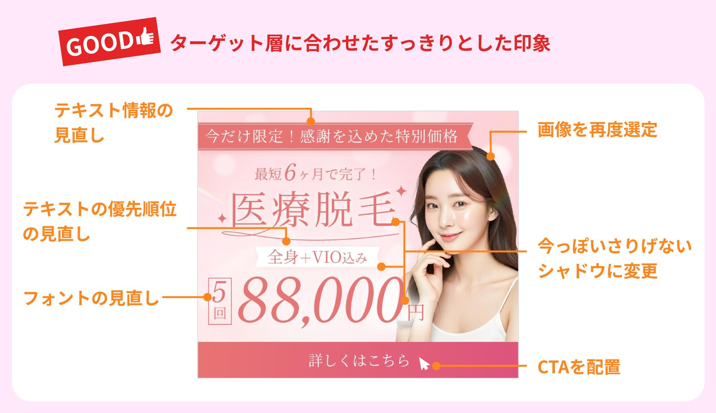 医療脱毛の広告なので肌が見えている女性の画像を選んだ点は良いと思いますが、今回はターゲット層も20代と若く、内容も美容系なのでツヤ感のある肌の方が魅力的だったかもしれません😣