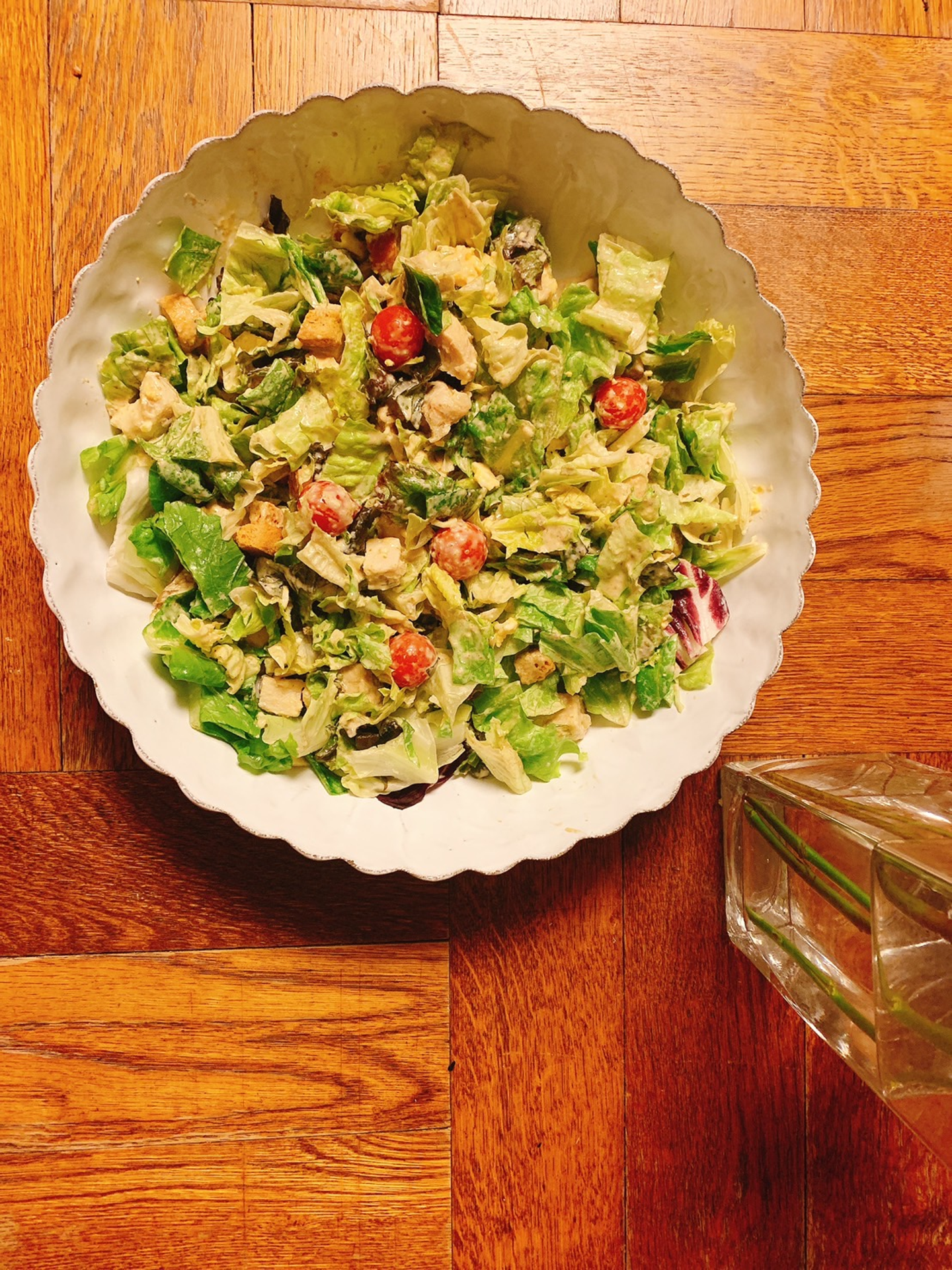 - 塩チキンと濃厚ごま油ドレッシングのサラダ