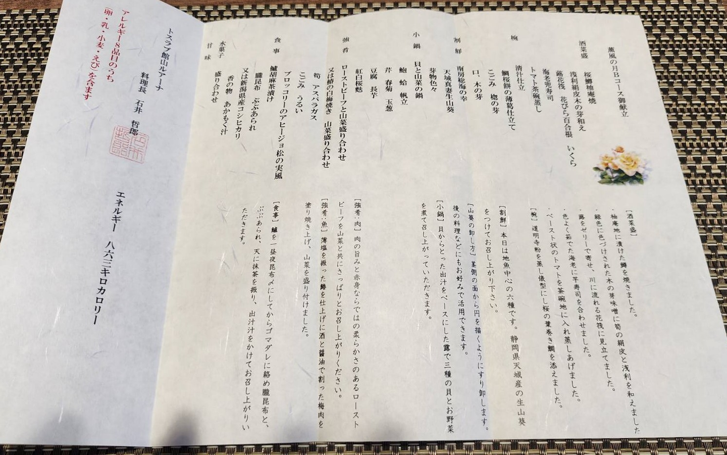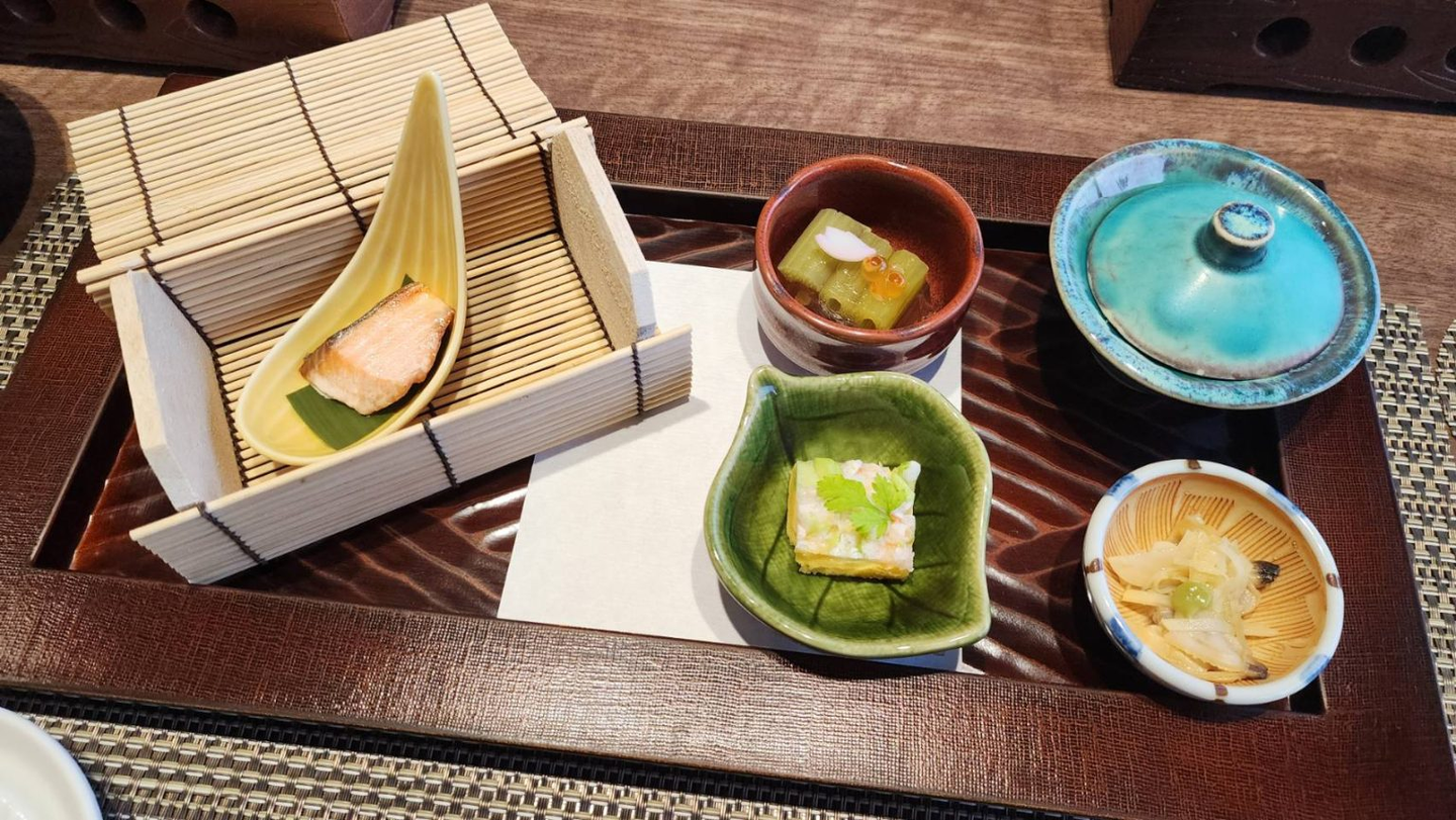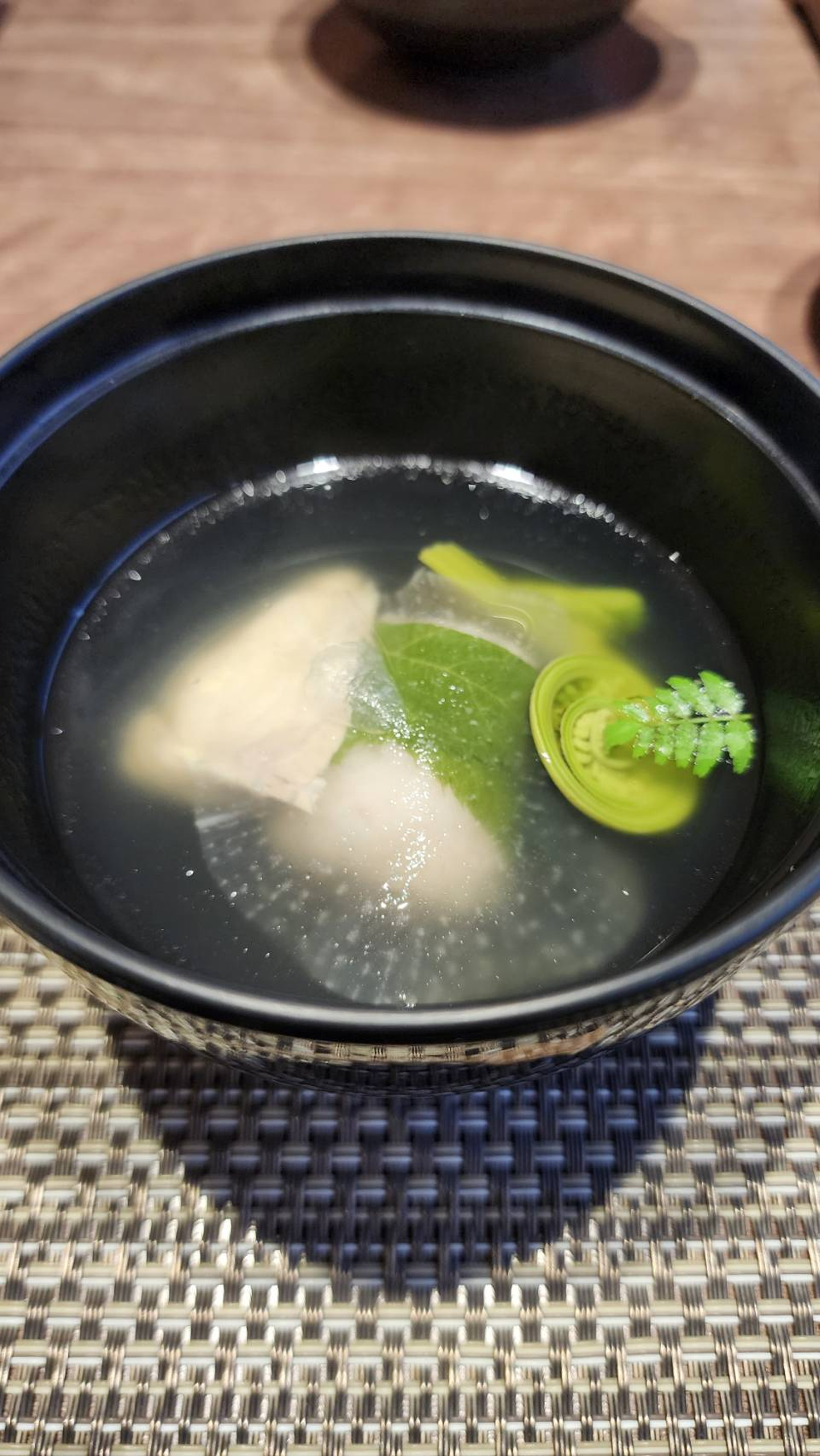 自分でおろした山葵をつけて食べる刺身、鮑やハマグリなど貝の出汁と山菜の青苦さがアクセントになっている小鍋、朧昆布と濃厚な出汁がかかっている締めの胡麻茶漬けなど、どれも全てが丁寧で美味しい!