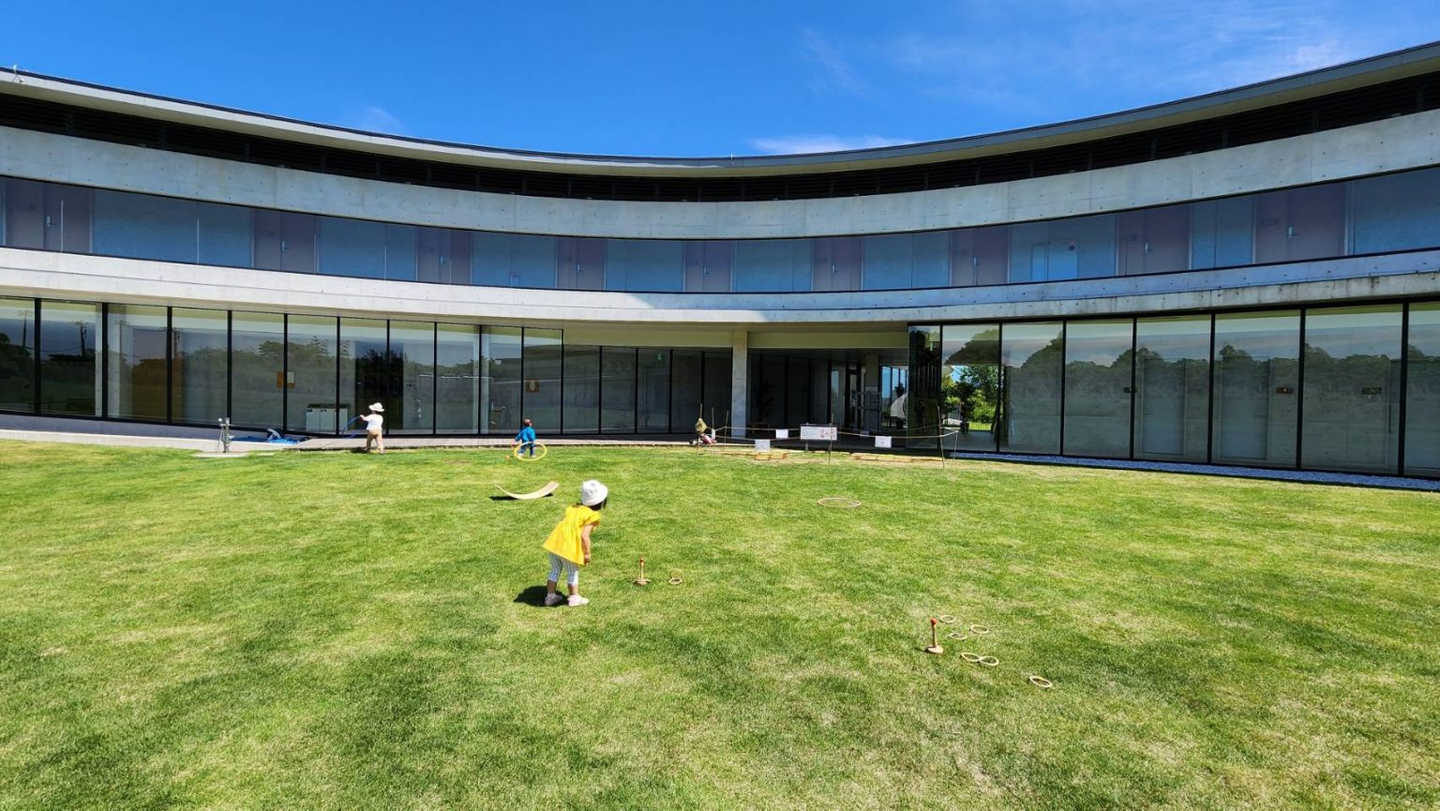 コーヒーを飲み終える前に子供ら3人が遊びたいモードに入ってしまい、フロントでシートとバトミントンを借りて中央の広場へ!