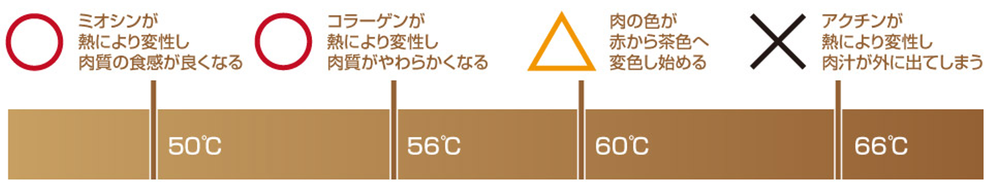 50度で「ミオシン」がやわらかく、56度で「コラーゲン」がゲル状になりさらにやわらかくなります。66度以上になると水分を多く含んだアクチンが破裂し、肉汁が肉の外にこぼれてしまいます。70度になると「コラーゲン」が再結合し、お肉が硬くなります。
