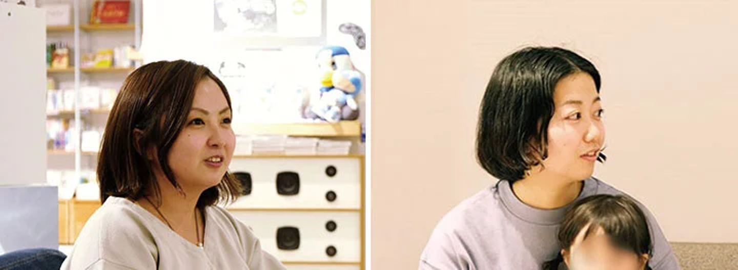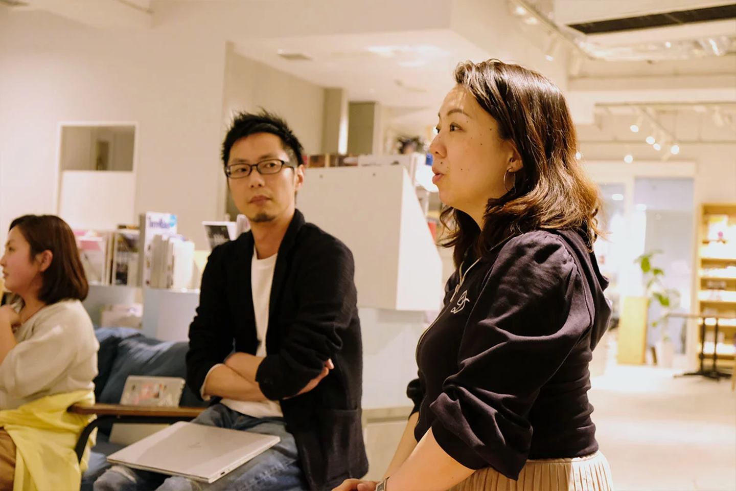 今回私が参加した「BOOK LAB TOKYOとこれからを話そうの会」は、コーポレート・コミュニケーション部の押切(写真左。BOOK LAB TOKYOの元店長で、現在はグループ全体を連携したコミュニティづくりに携わっています)の発案で、社内の有志が集まり、現店長の津田さん(写真右。この日はお子さん連れでの参加でした)を交え、インフォバーングループとして更にBOOK LAB TOKYOを活用していくための話をしようという趣旨で開催されました。