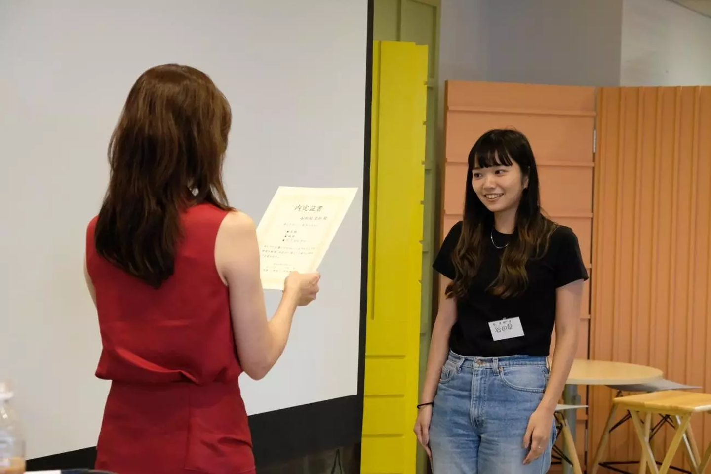 今回の内定証書は「あなたの活躍を期待し〜」みたいなありきたりの文言だけでない、内定者各々の魅力を3点記載したオリジナルのもの。「マーケティング愛」「シュークリーム作り」「背泳ぎ」「サブカル」…など、みんなの魅力はそれぞれバラバラ。超個性的な内定者たちの三ツ星ポイントを聞いているだけでもワクワクしますね。