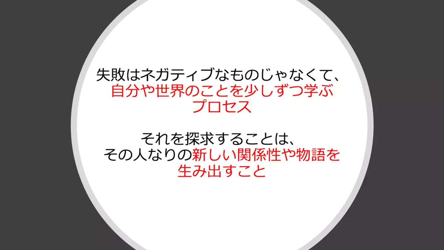 まずは、私の友人が映画製作の失敗をきっかけに、そのロケ地について勝手に何年もリサーチして学んでいったという事例を紹介しました。その友人は失敗をネガティブだとは捉えていませんでした。