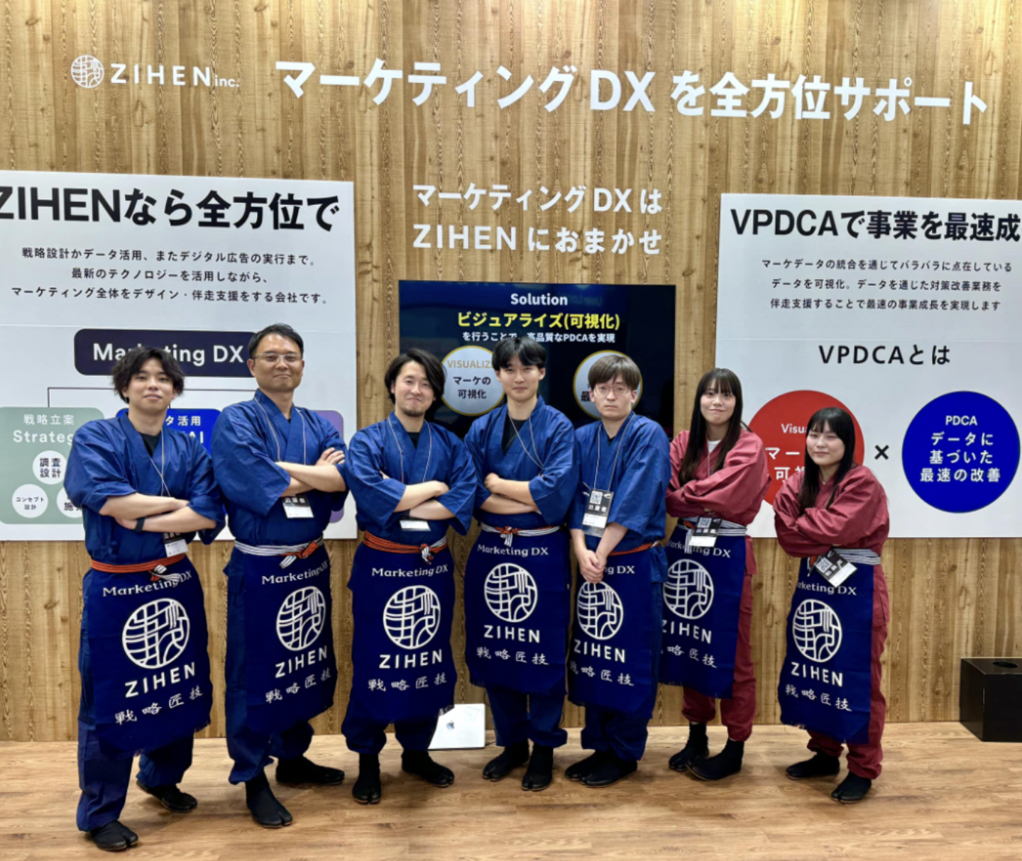 直近のオフライン施策では、自社の展示会に関するコンセプト設計、当日のオペレーションなどを担当させていただきました。「マーケDX領域の匠」というコンセプトを掲げ、手染めの前掛けを用意し、あえて和風で挑みました。会場内でも目を惹いたようで、沢山の反響をいただきました。