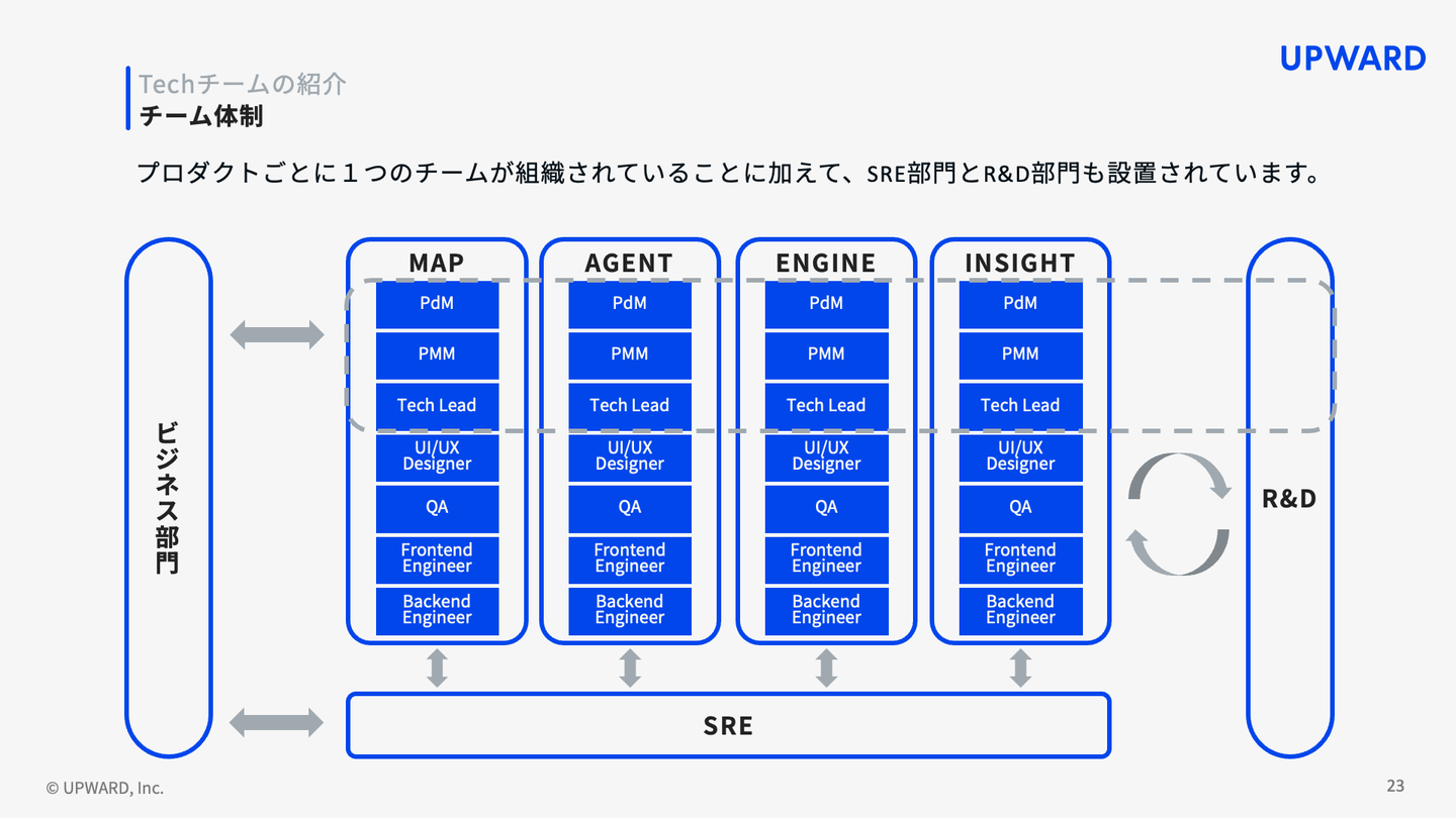 UPWARDでの会計年度は7月~6月です。来期FY24に向けて組織再編を進めております。現在まで、UPWARDでの主プロダクトはMAP、AGENT、ENGINEという3つでしたが、FY24からは開発体制を強化し、個々の機能強化・高度化に加えて新たなプロダクト開発を推進していく予定です。そのために、プロダクト/機能開発単位でチームを組成して、各々の責任範囲の明確化、マーケットへの迅速な提供を目指しています。