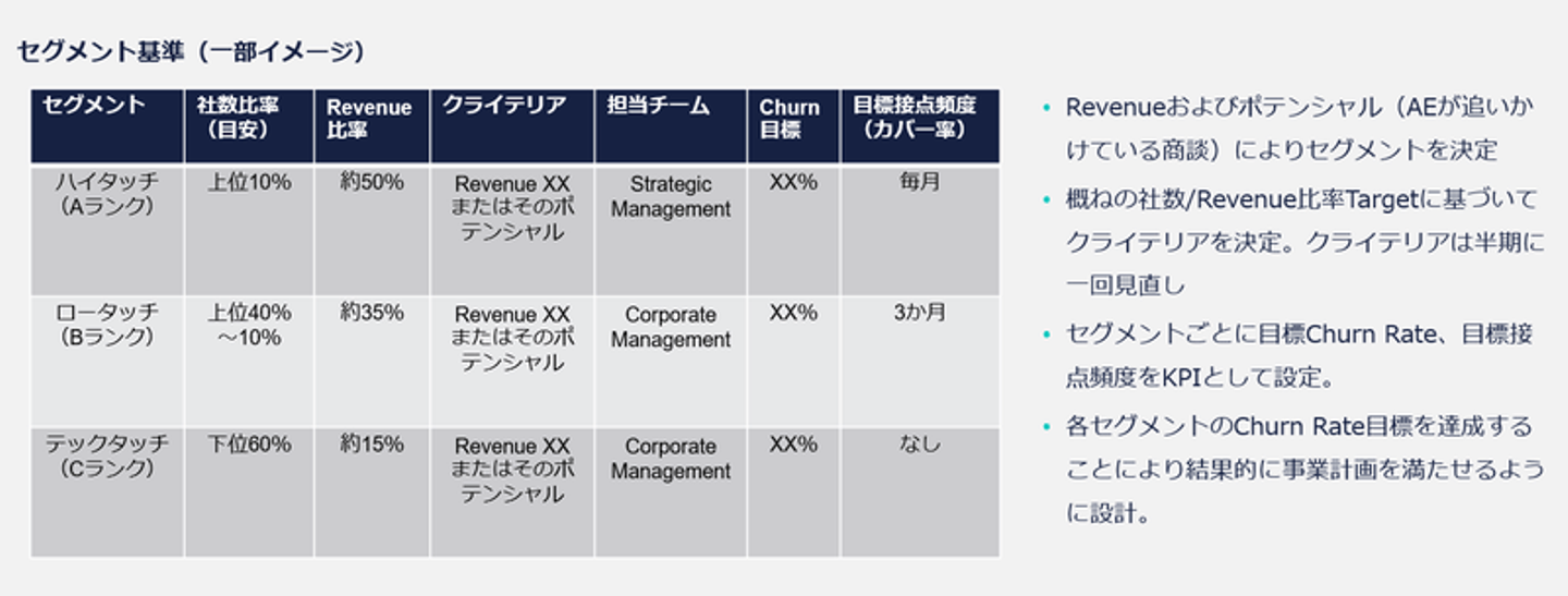 クライテリアの金額の決め方ですが、大まかな基準としてACV+ポテンシャルACVのTop10%の顧客をハイタッチ、その下30%をロータッチ、以下60%をテックタッチとしています。加えて、上述したハイタッチを担当するストラテジックマネジメント部が一人5~10社程度、ロータッチを担当するコーポ―レートマネジメント部が20~30社程度担当するというのが適正値だと考え、最終的にはマネージャー間で微調整して決めています。また、顧客の構成は常に変わるため、半年に一回基準金額の見直しを行っています。