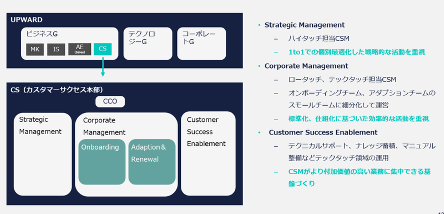 さらに、コーポレートマネジメント部はさらにオンボーディングチームとアダプションチームの2つのサブチームに分けています。両チームとも名前の通りですが、オンボーディングチームは新規顧客の受注後からプロダクトの利用開始までのオンボーディングのご支援を行い、アダプションチームはオンボーディングチームからオンボーディングが完了した顧客を引き継ぎ、継続的な支援や契約更新業務を行っていきます。