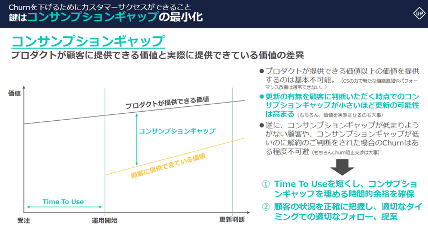 接点頻度を重要視している理由は、CSがChurnRateを下げるために行えることを一言でいうとコンサンプションギャップの最小化であると考えていて、コンサンプションギャップの最小化のために接点頻度を高く保つことが重要であるためです。コンサンプションギャップとは「プロダクトを通じて顧客が得られていると感じている価値」と「プロダクトが提供できる最大価値」の差異のことです。CSはどんなに努力してもプロダクトの価値以上の価値提供を顧客にすることはできませんので、日々の活動を通じて、プロダクトが提供できる価値をなるべく顧客が享受できている状態を作り出すことが責務であるといえます。コンサンプションギャップを小さくするために継続的に顧客と接点をもち、状況を把握し、さらなる活用を促す提案が必要ですし、顧客のビジネスやニーズ、課題は日々目まぐるしく変わりますので、半年前に満足してUPWARDを使っていた顧客が、今も満足して使えているとは限らないので、気づかないうちにコンサンプションギャップが増加していたということがないようにも定期接点は非常に重要です。