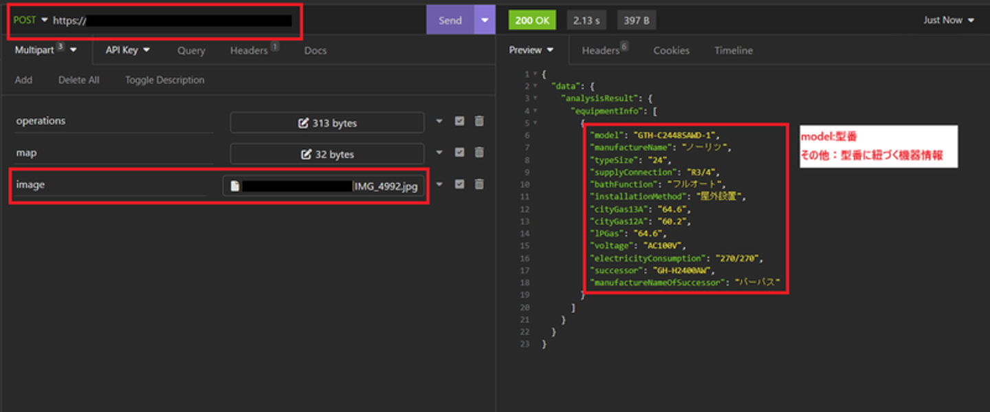 Insomniaの画面で「POST」にアプリの接続先URLを入力します。「image」で解析する画像を選択し、リクエストを送信すると給湯器の型番と型番に紐づくメーカーなどの機器情報がJSON形式で返って来ます(図4)。