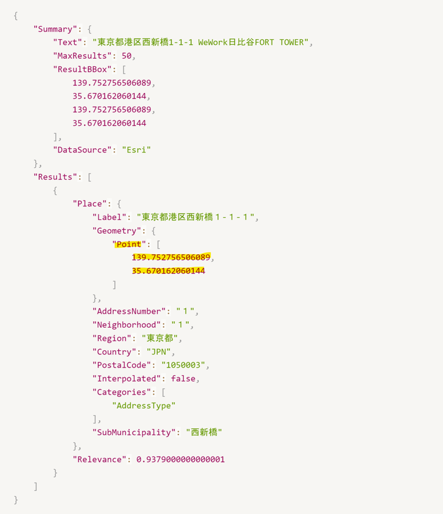 { "Summary": { "Text": "東京都港区西新橋1-1-1 WeWork日比谷FORT TOWER", "MaxResults": 50, "ResultBBox": [ 139.752756506089, 35.670162060144, 139.752756506089, 35.670162060144 ], "DataSource": "Esri" }, "Results": [ { "Place": { "Label": "東京都港区西新橋1-1-1", "Geometry": { "Point": [ 139.752756506089, 35.670162060144 ] }, "AddressNumber": "1", "Neighborhood": "1", "Region": "東京都", "Country": "JPN", "PostalCode": "1050003", "Interpolated": false, "Categories": [ "AddressType" ], "SubMunicipality": "西新橋" }, "Relevance": 0.9379000000000001 } ] }「Results」のなかの「Point」に表示されている値がジオコーディング結果です。では、この結果をOpen Street Map上で確認してみましょう。