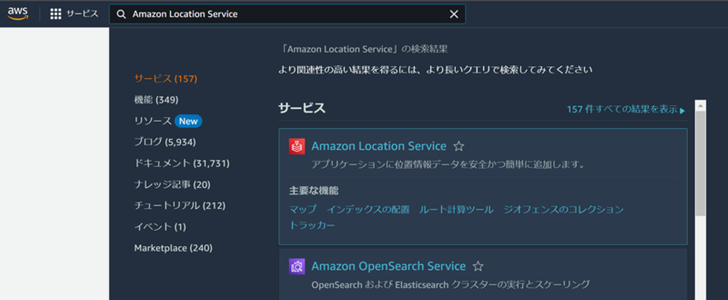AWSのマネジメントコンソールにログインしたら、検索欄で「Amazon Location Service」を検索し、表示されたパネルをクリックします。