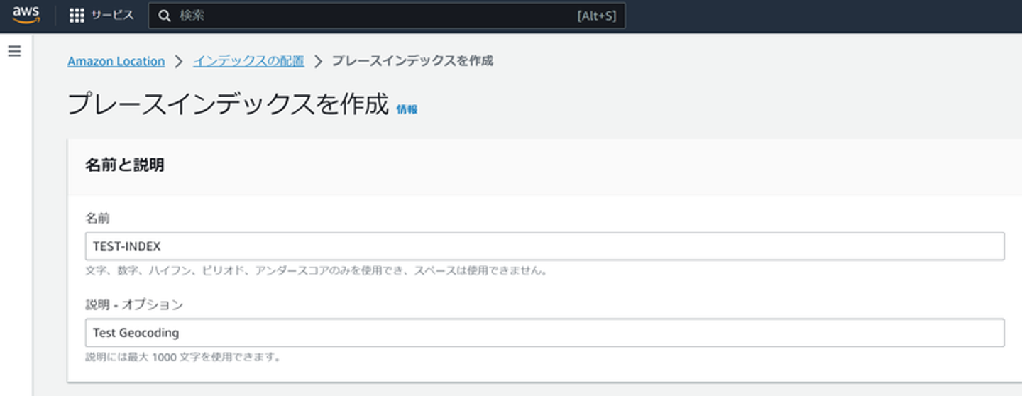 名前に「TEST-INDEX」、説明に「Test Geocoding」を入力