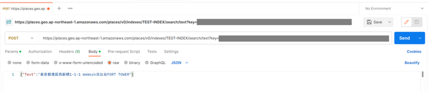 https://places.geo.ap-northeast-1.amazonaws.com/places/v0/indexes/TEST-INDEX/search/textを入力します。