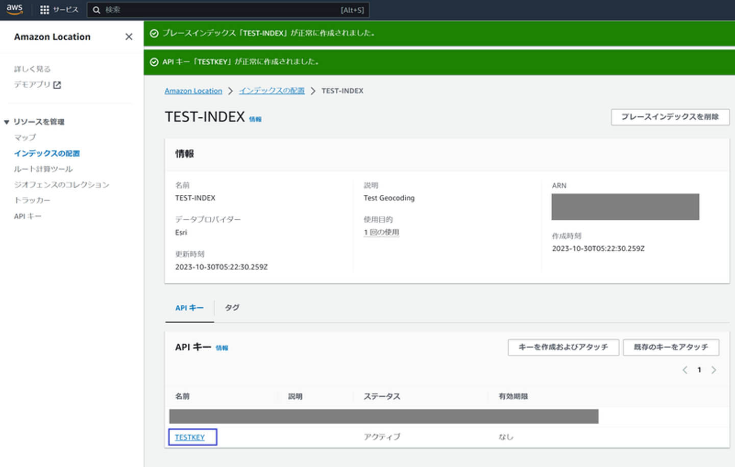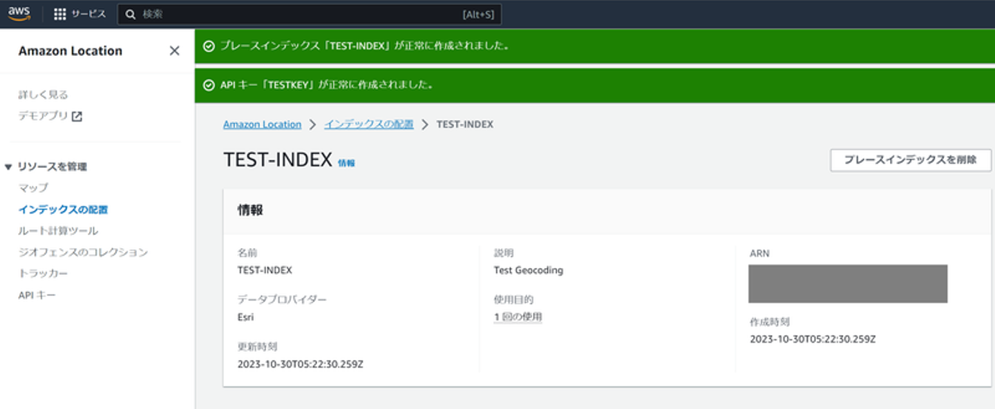 以上でプレースインデックスの作成は完了です。これでAmazon Location Serviceを利用したジオコーディングを行う準備が整いました。