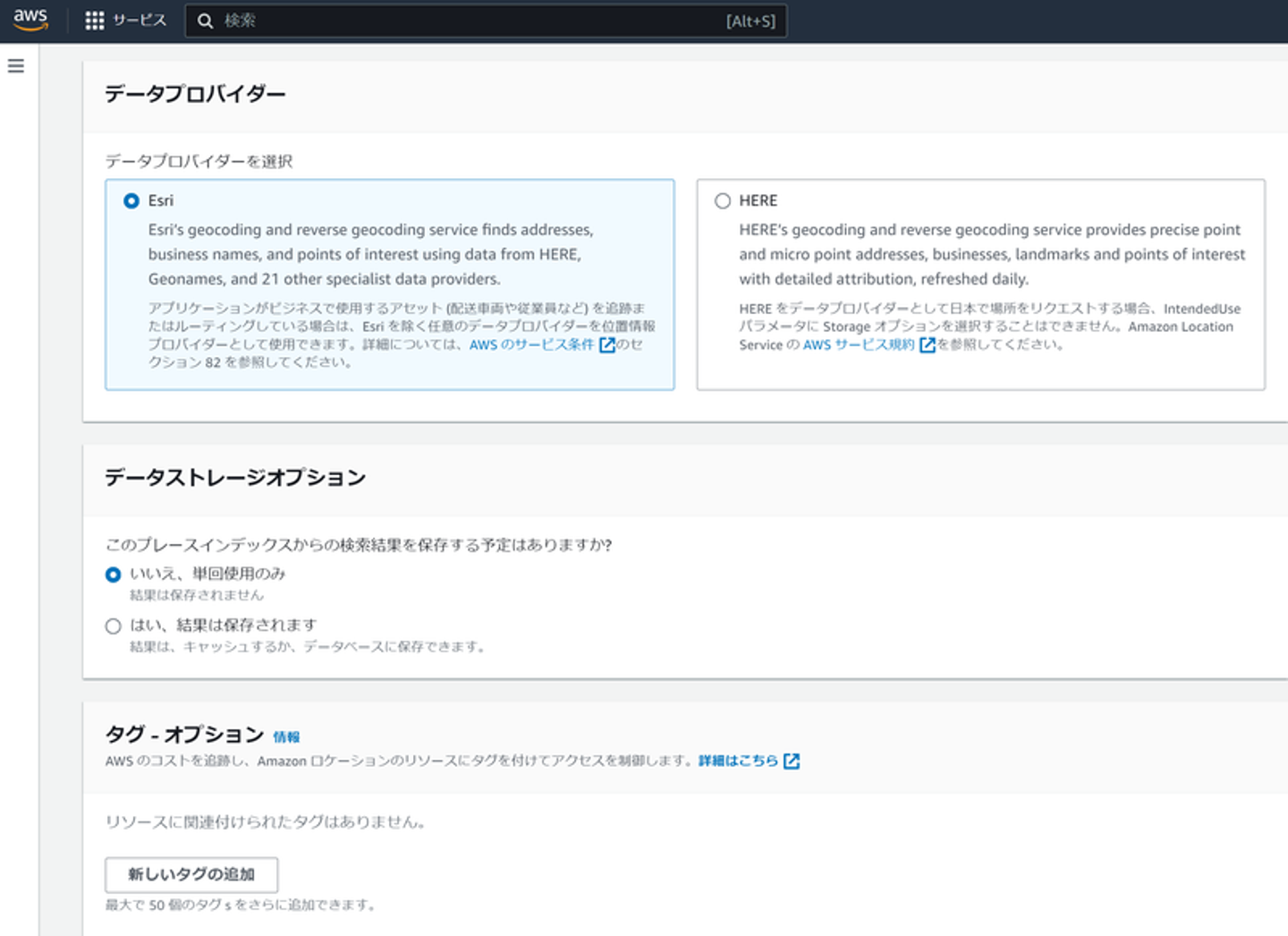 Amazon Location Serviceでジオコーディングを行うには「プレースインデックス」というリソースを作成する必要があります。今回はリージョンを東京(ap-northeast-1)、データプロバイダーに「Esri」を選択することにして、作業を進めます。