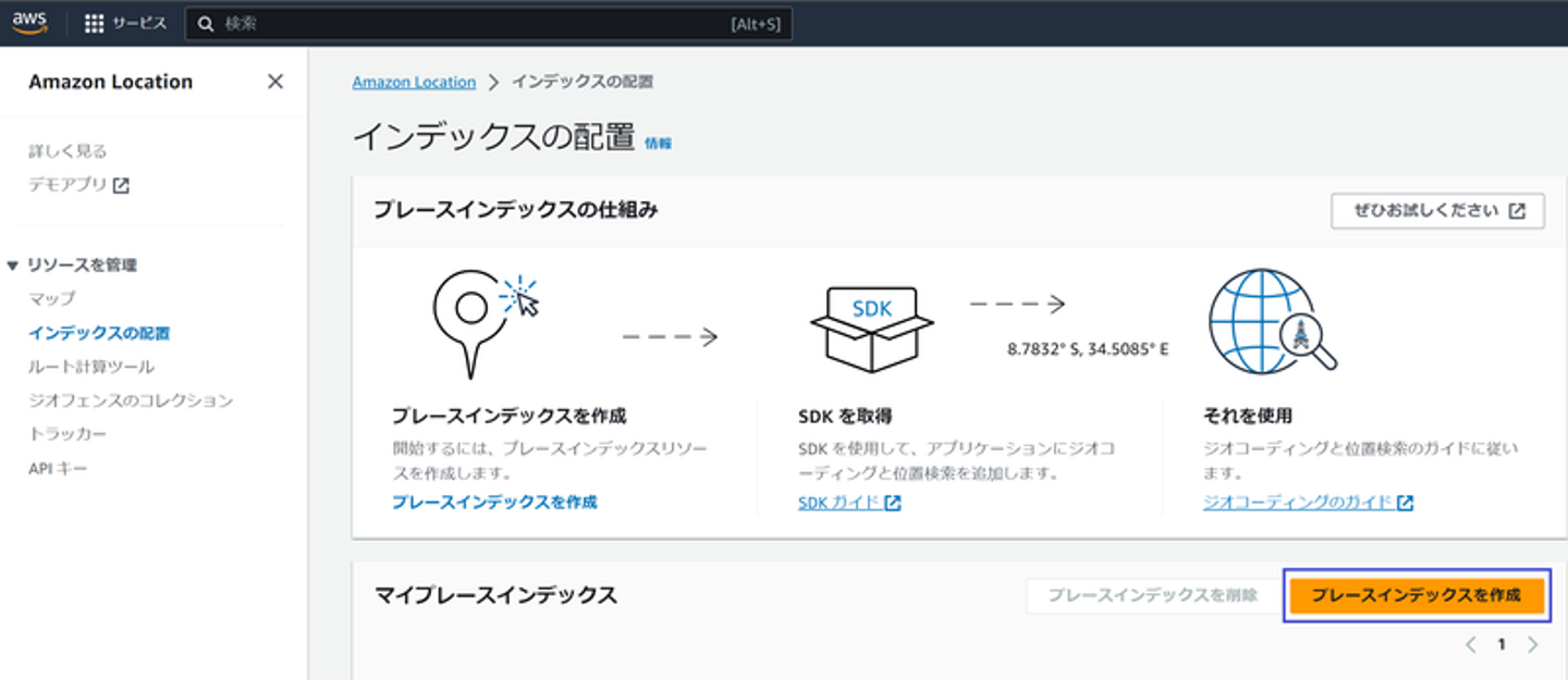 Amazon Location Serviceの画面が表示されたら「インデックスの配置」をクリックします。