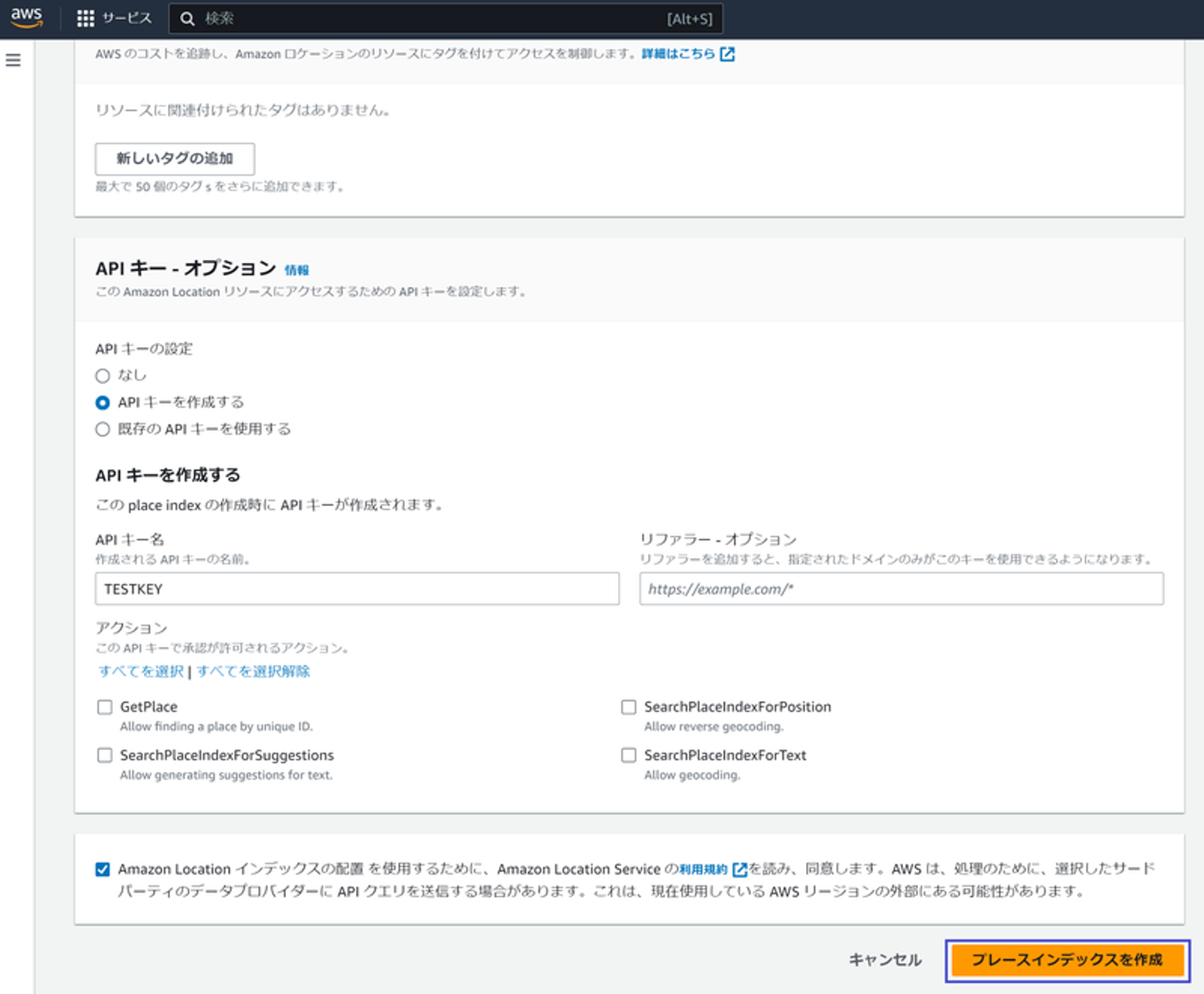「APIキーを作成する」をチェック。APIキー名に「TESTKEY」を入力。アクションは「SearchPlaceIndexForText」をチェック。