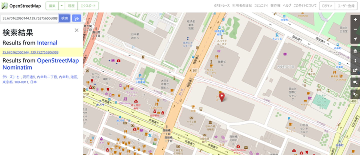 「35.670162060144,139.752756506089」で検索したところ、UPWARDの東京本社が置かれている「WeWork日比谷FORT TOWER」の地点が取得できていることがわかりました。