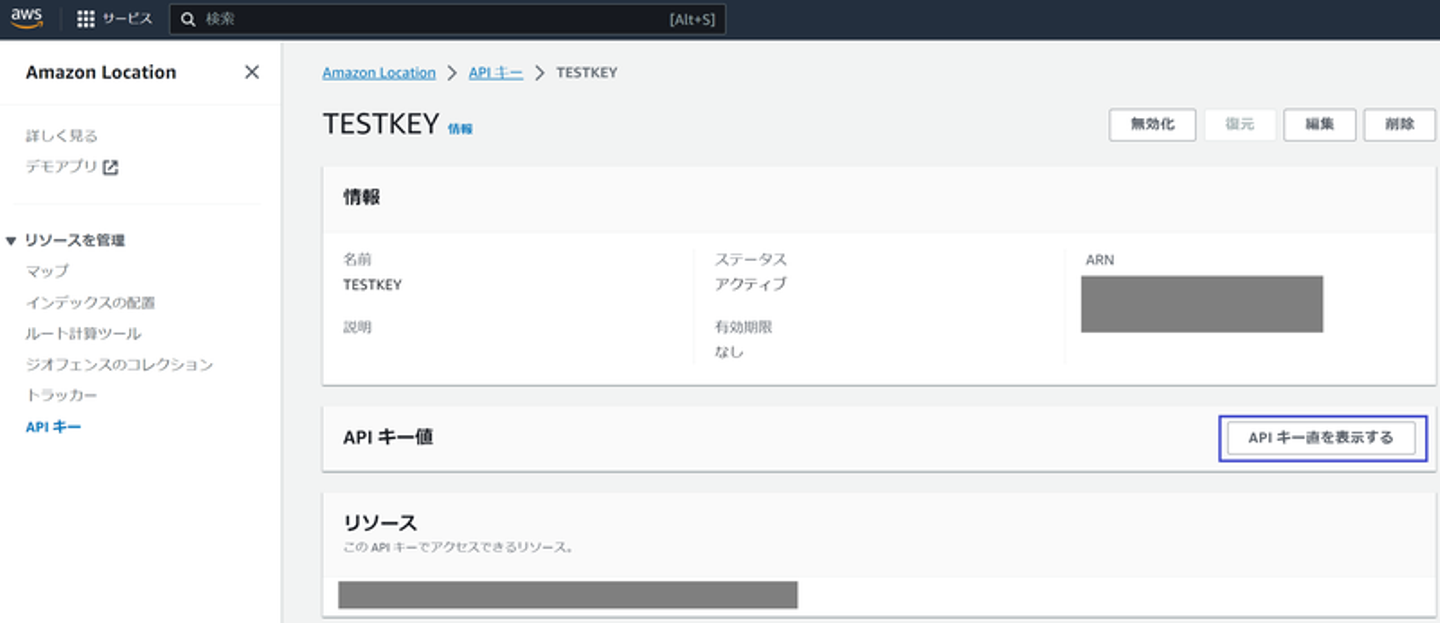 APIキーについては、さきほどプレースインデックスを作成した画面の下段にAPIキーへのリンクが表示されているので、それをクリックします。