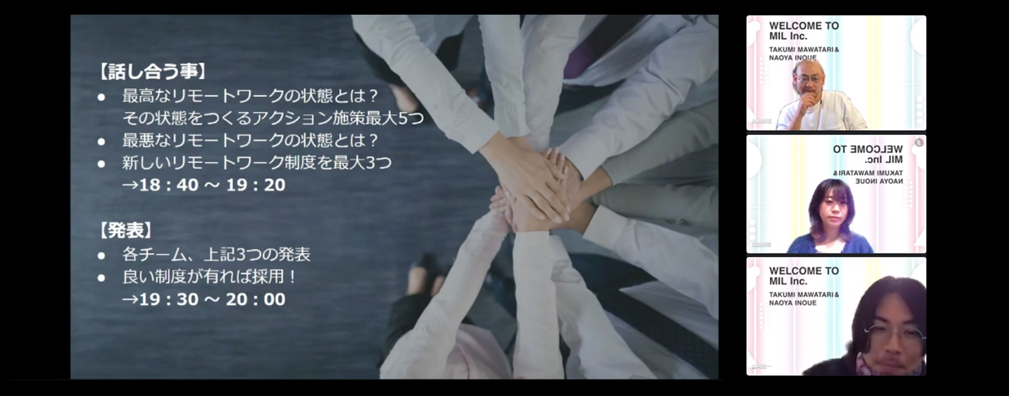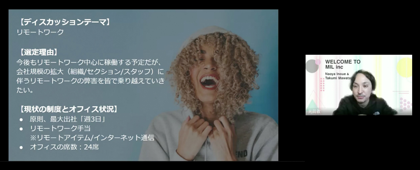 6/ チームディスカッション 下半期総会の最後には、チームディスカッションを行いました。 今回のテーマは「リモートワーク」についてです。