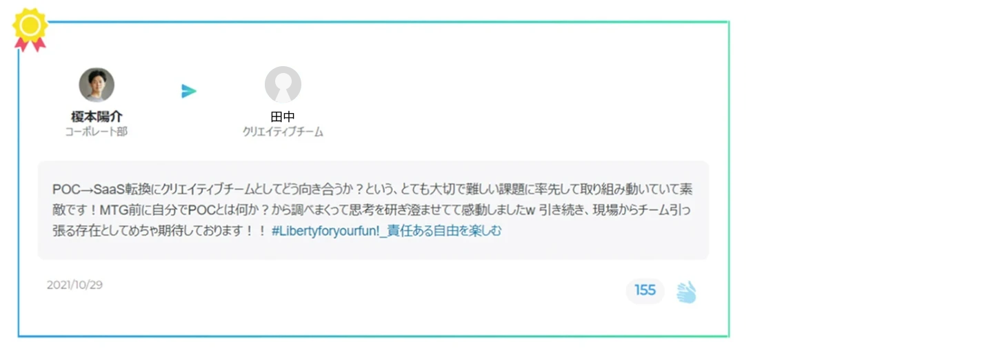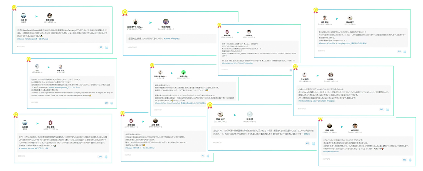 🏆 What’s「MIL GIFT Award」? MILでは行動指針をバリューではなく、”MILらしさ”という意味をこめて「MILNESS」と呼びます。「MIL GIFT Award」では、3つのMILNESSそれぞれを最も体現したメンバーが表彰されました。選定方法はユニポス(※)を採用。日々スタッフがユニポスを通じて、ハッシュタグ付きの賞賛コメントを送っている中から選定しています。