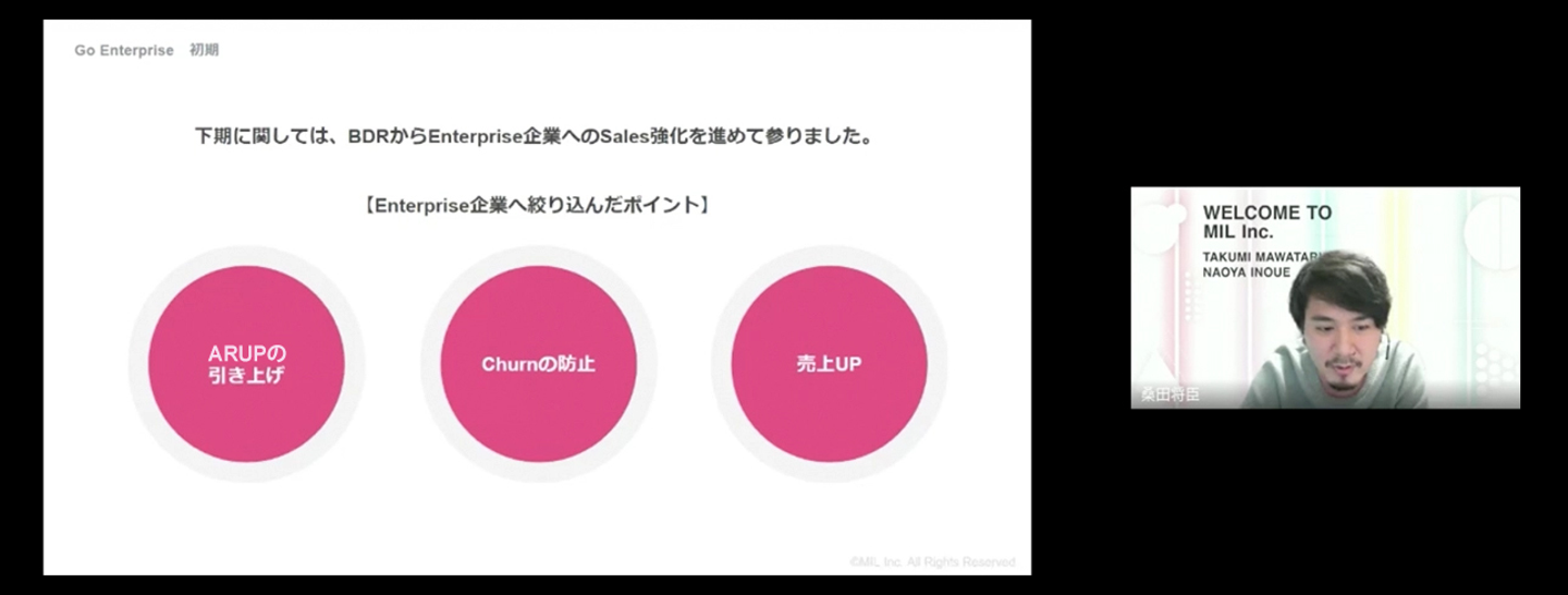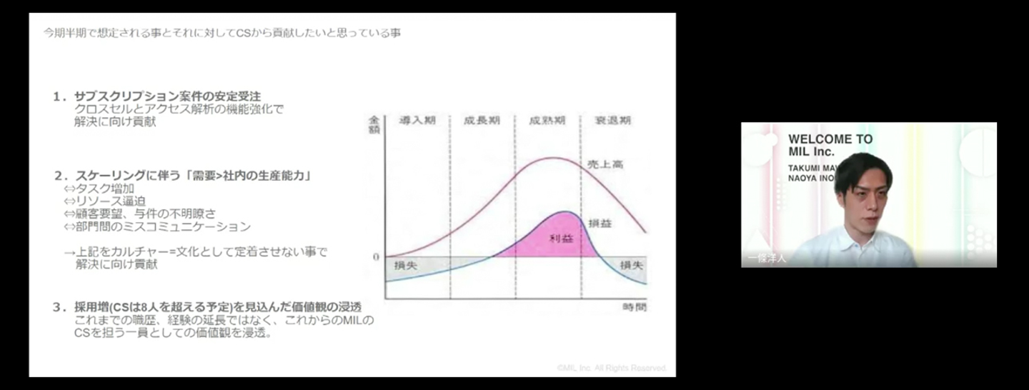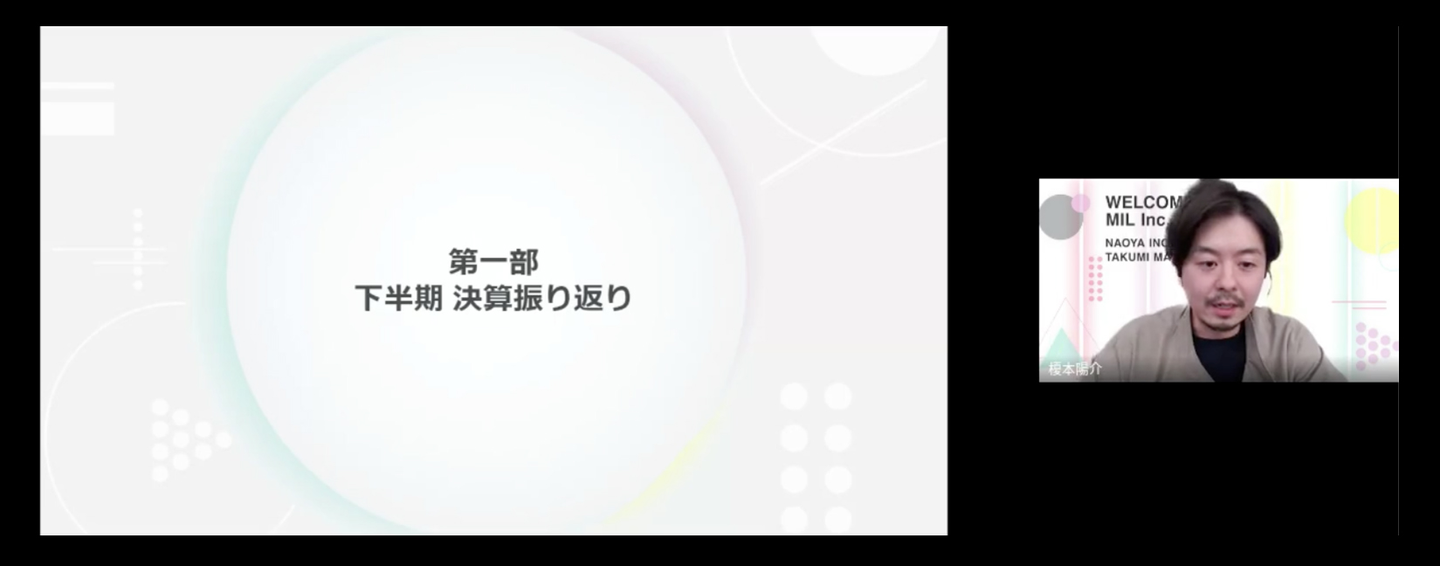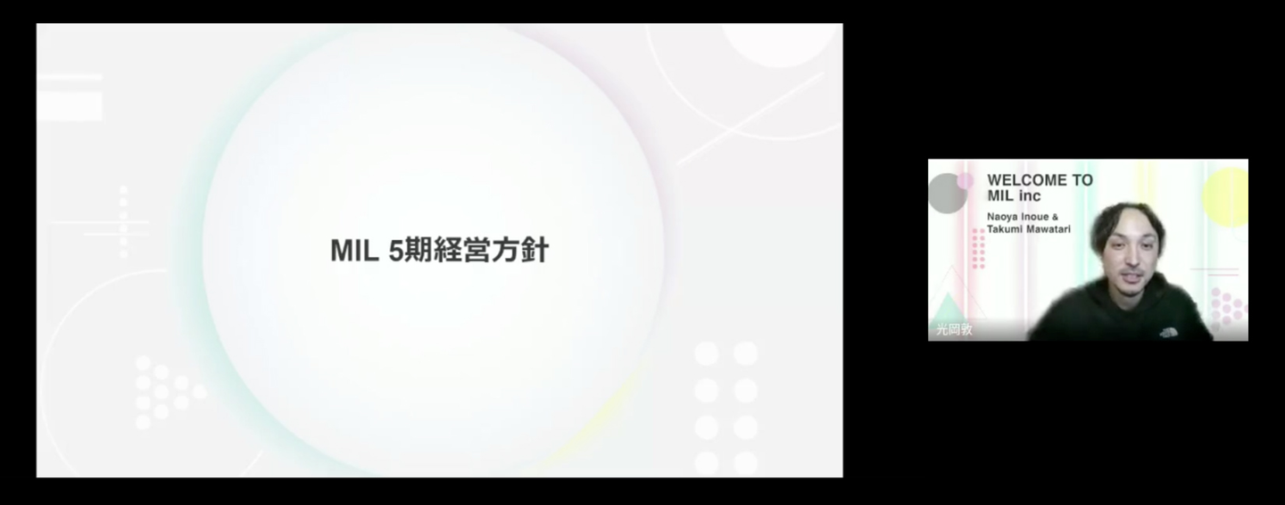 ▼CEO 光岡より 新入社員の役割は周りに「刺激」を与えることです。これまでのMILの考え方に囚われず、新たな目線で挑戦していくことが大切になります。その刺激が他のメンバーの行動を変え、会社を変え、皆で成長していける環境を作ります。もちろん、既存メンバーは刺激をもらうだけでなく、自ら周りを巻き込み恐れずに行動し続けるマインドを忘れてはなりません。見えない壁を作らず、一つのチームとして新しいことにチャレンジし続けていきましょう!改めて、入社おめでとうございます! 2 / 業績発表 MILの下半期は、たくさんのことを「変えた」期になりました。ターゲットや組織体制等、さらにはMILとしての提供価値まで。そして「変えた」結果どうなったのかを全員で振り返る場となりました。