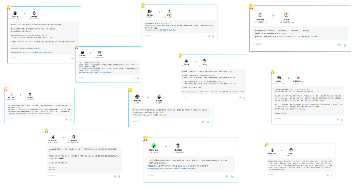 MILで活用しているピアボーナスサービス『Unipos』では、贈るポイントを各自で決めてメッセージと共に送信することが可能で、そのメッセージに共感したメンバーもポイントを贈ることができる仕組みです。